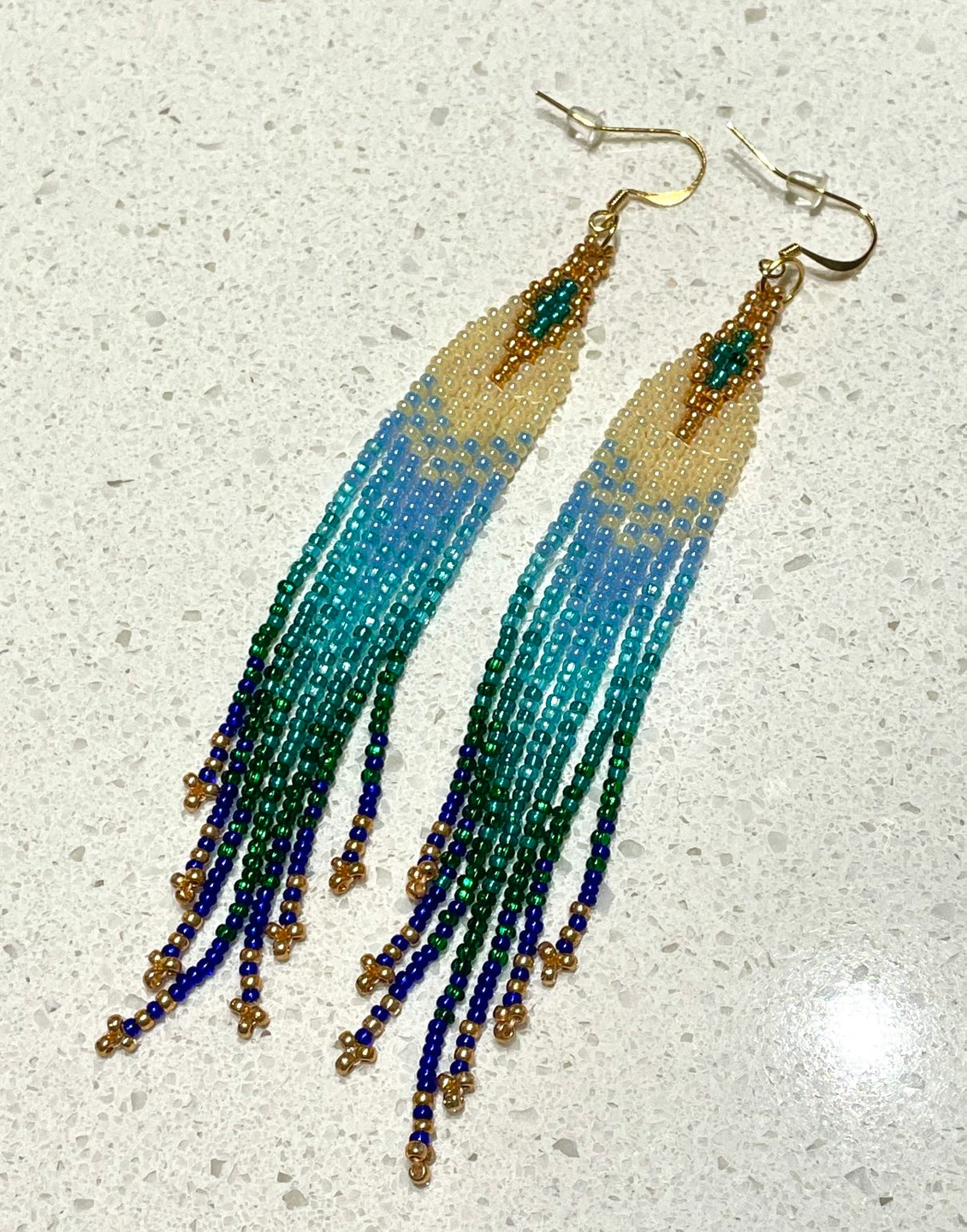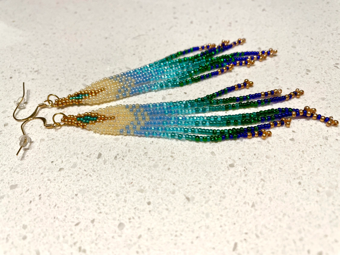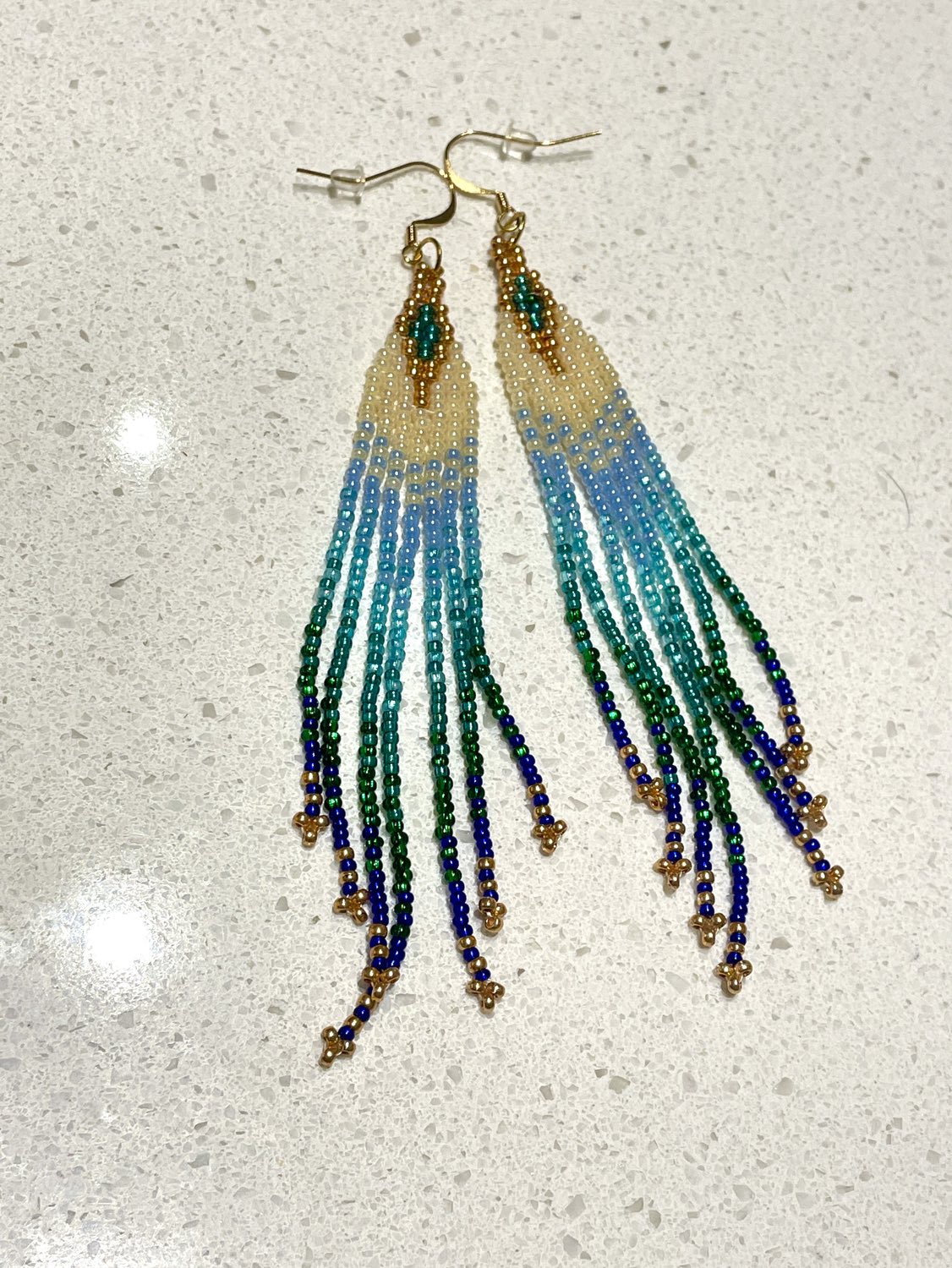 Pick up at Dundas and River Made by Juliet Mackie, a Métis artist in Montreal. 5” long, beautiful oceanic colours. Very elegant Originally purchased at $60