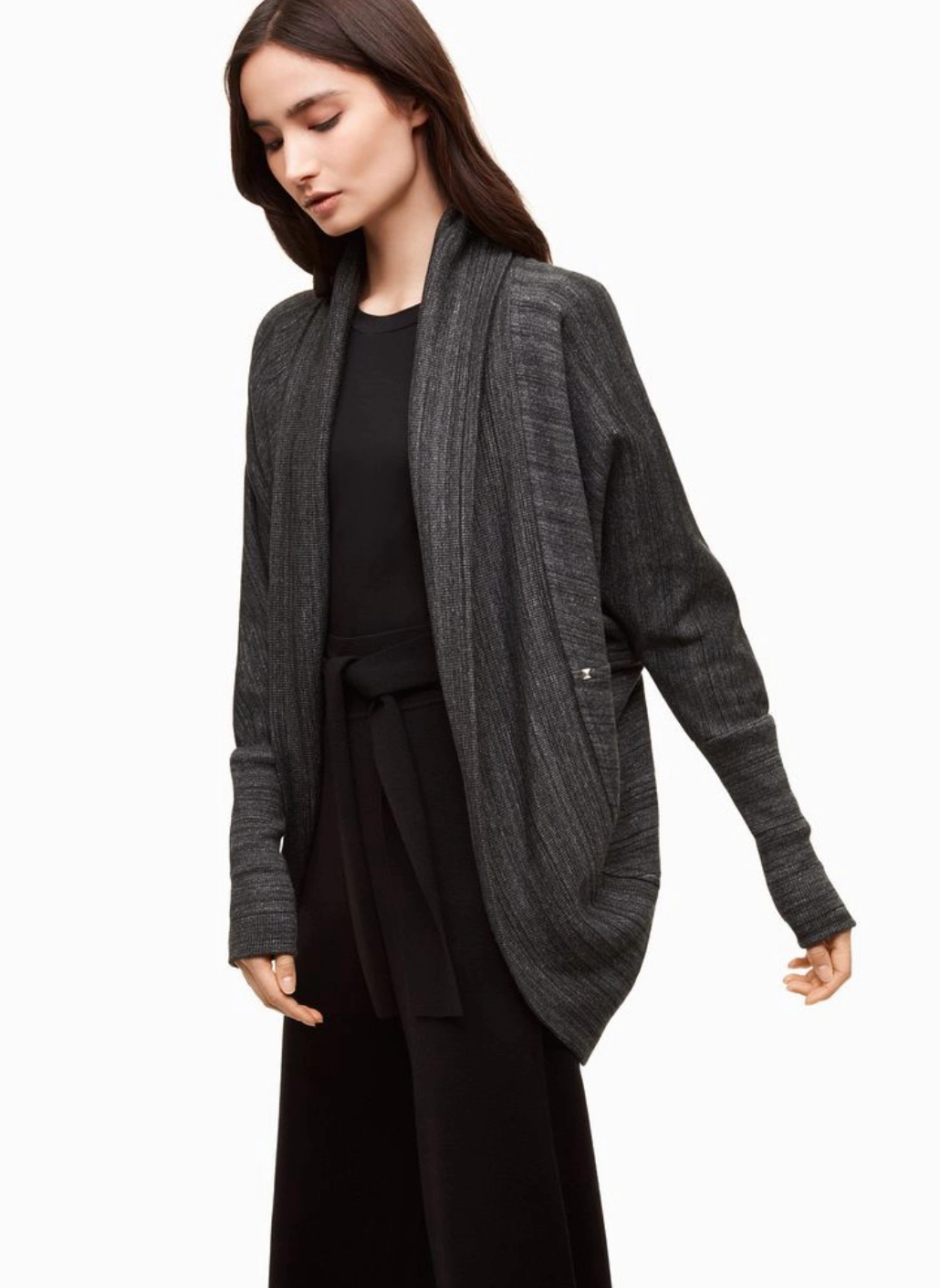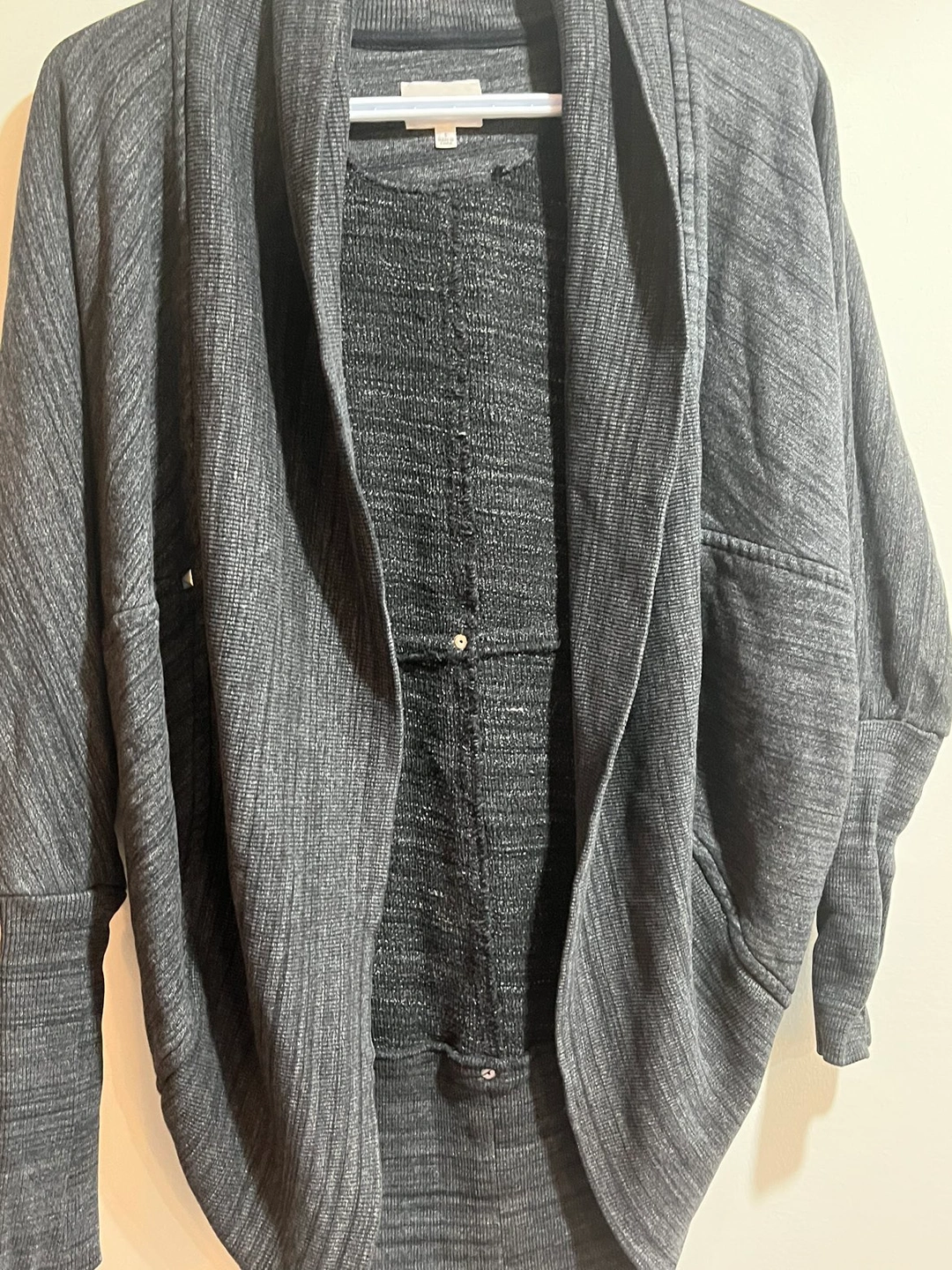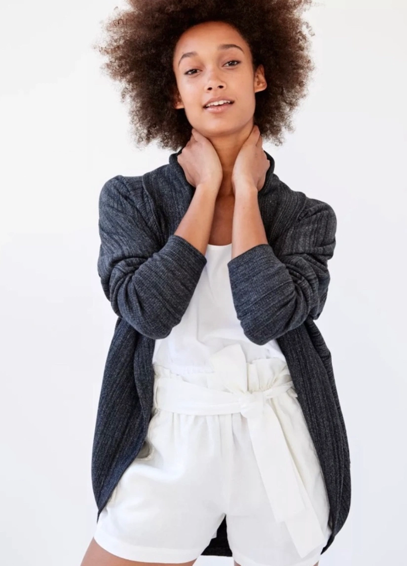 This is a cocoon sweater with ribbed sleeves and pyramid stud details. It's made with a brushed fabric that's super soft