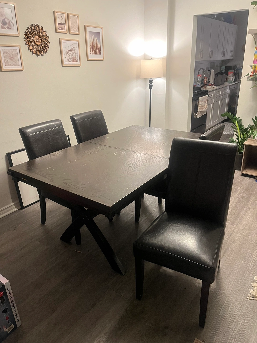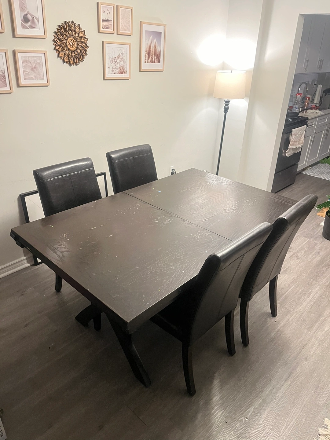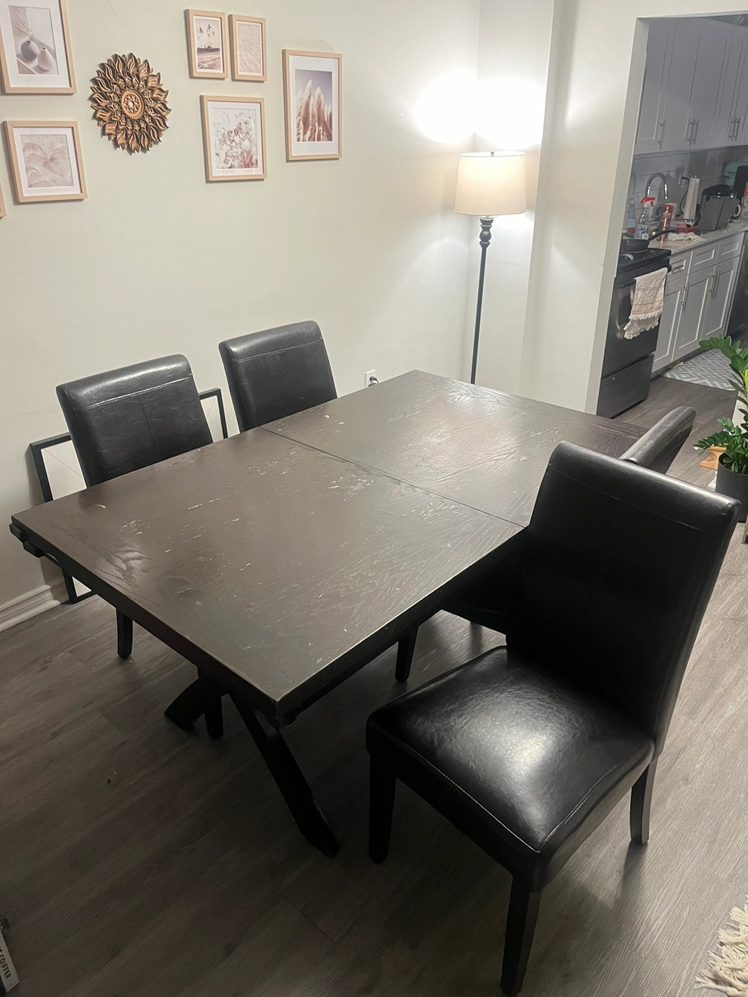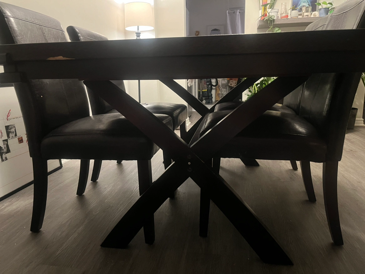 It’s not brand new and has some water stains, but the comfortable chairs and table leaf make up for it.