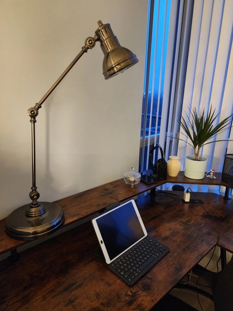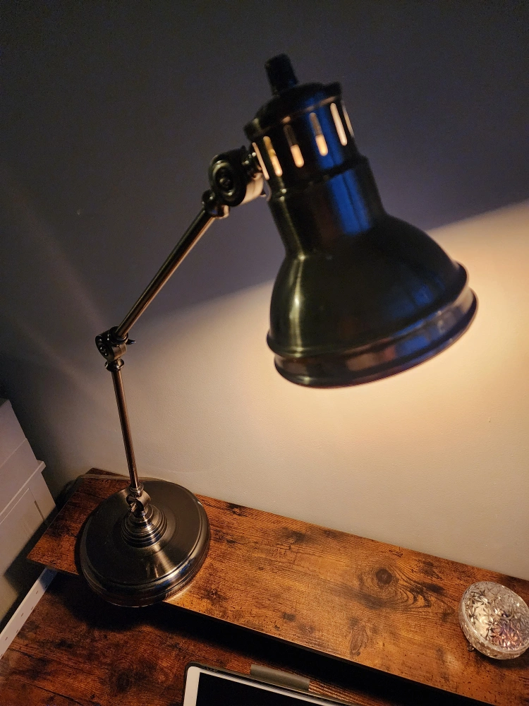 It has a vintage steampunk kind of vibe. Can be adjusted in multiple places. I use it to light up my workspace.