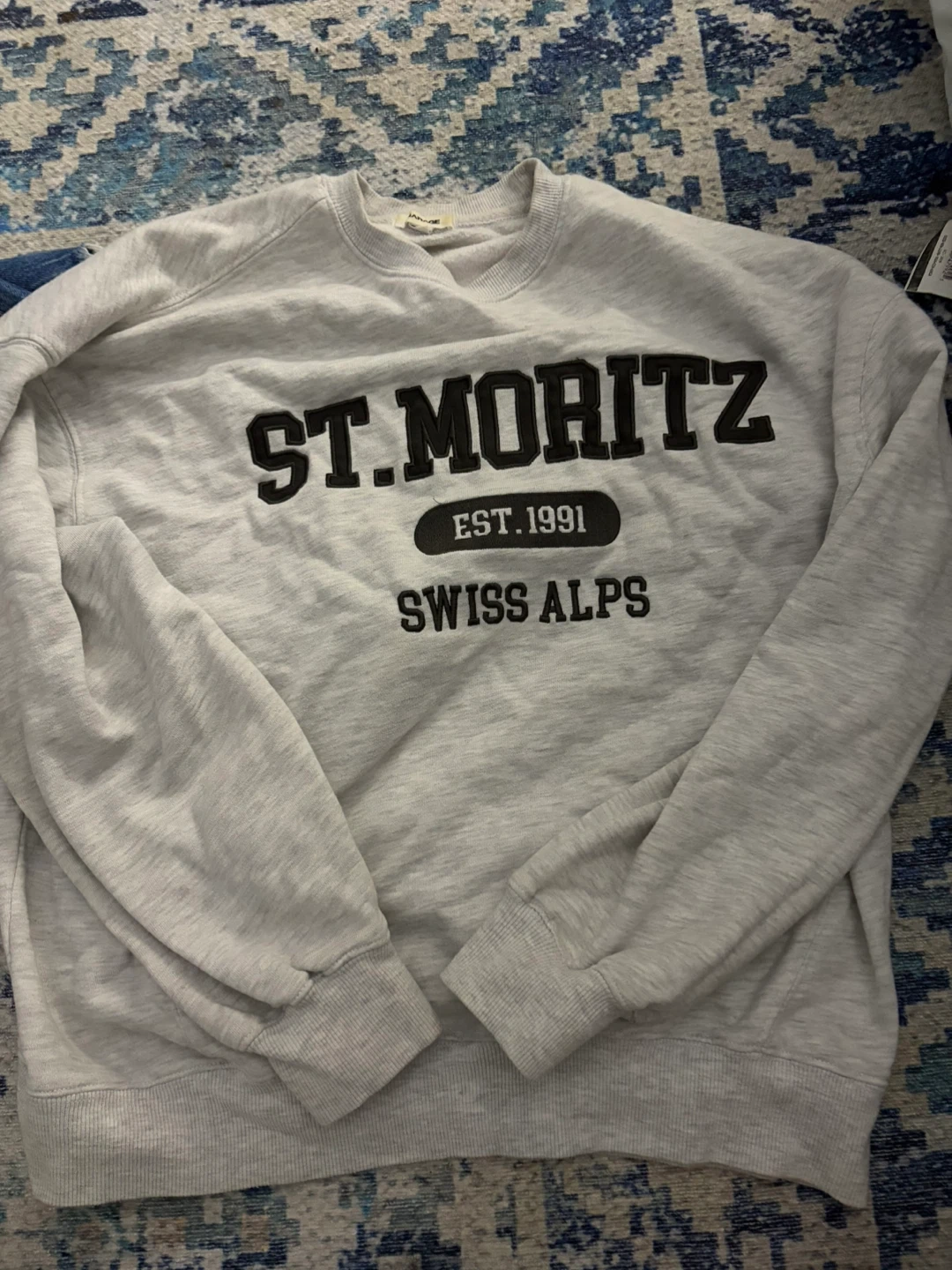 Grey crewneck sweatshirt with "ST. MORITZ EST. 1991 SWISS ALPS" graphic print. Crew neck and long sleeves. Material is a cotton blend. It's a cozy piece for cooler weather.
