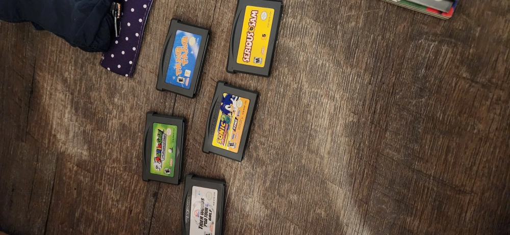 Nintendo DS with games: Mario Golf, Sonic Advance 3, Mario Pinball Land, Tang Tang, Tiger wood Tour, and Serious Sam