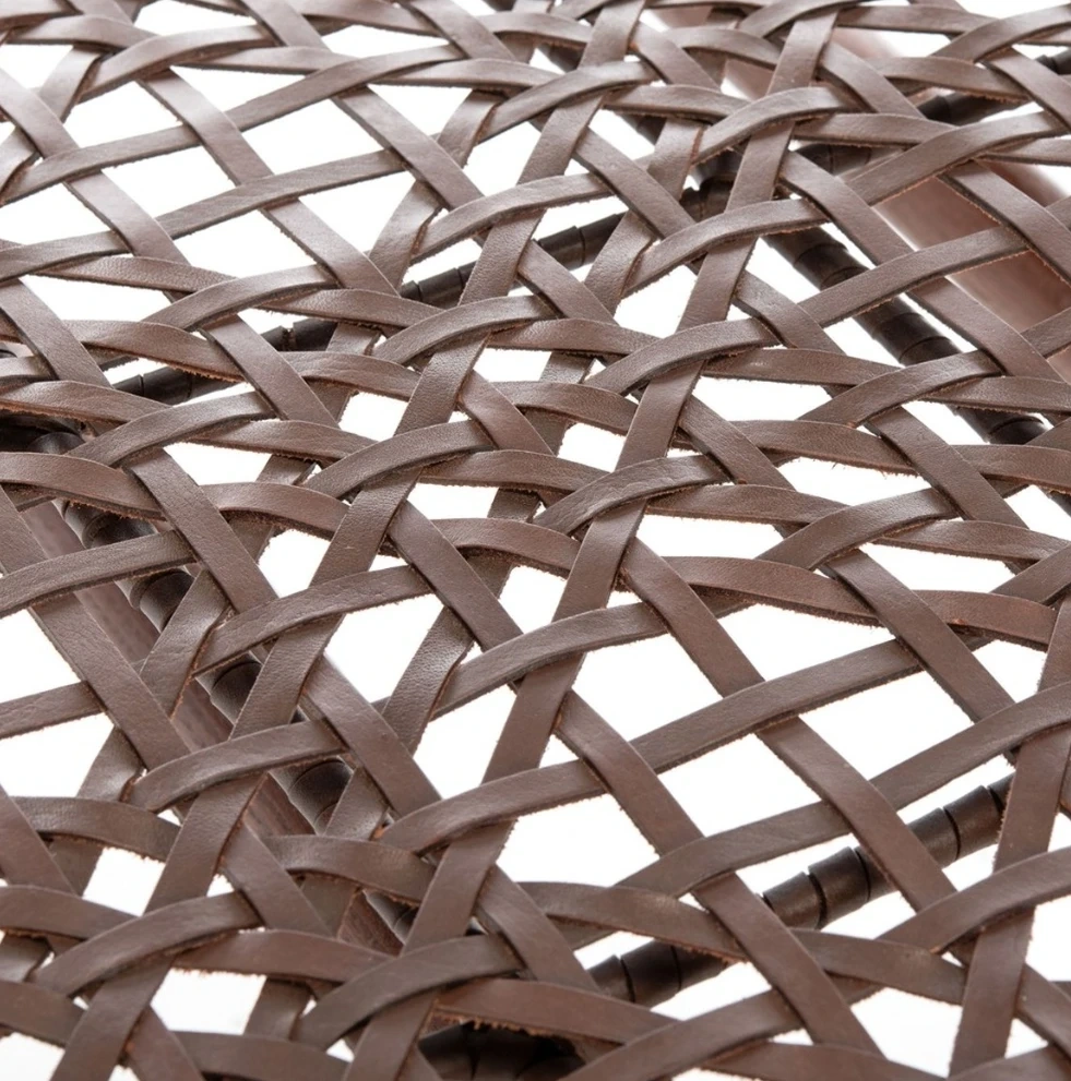 Woven leather strips create a beautiful pattern and offer sturdy support