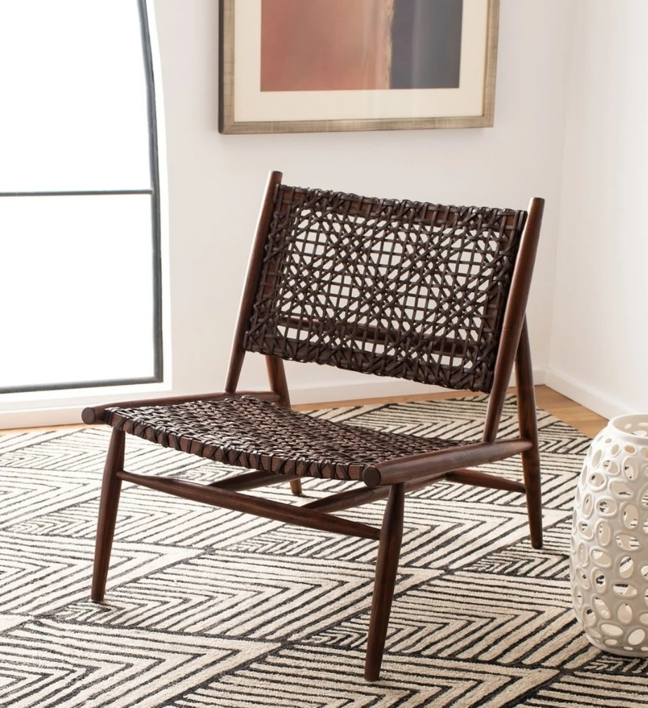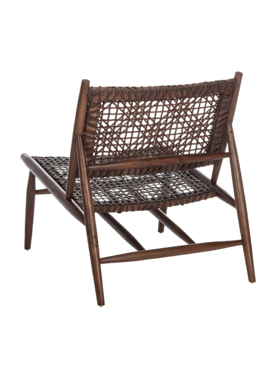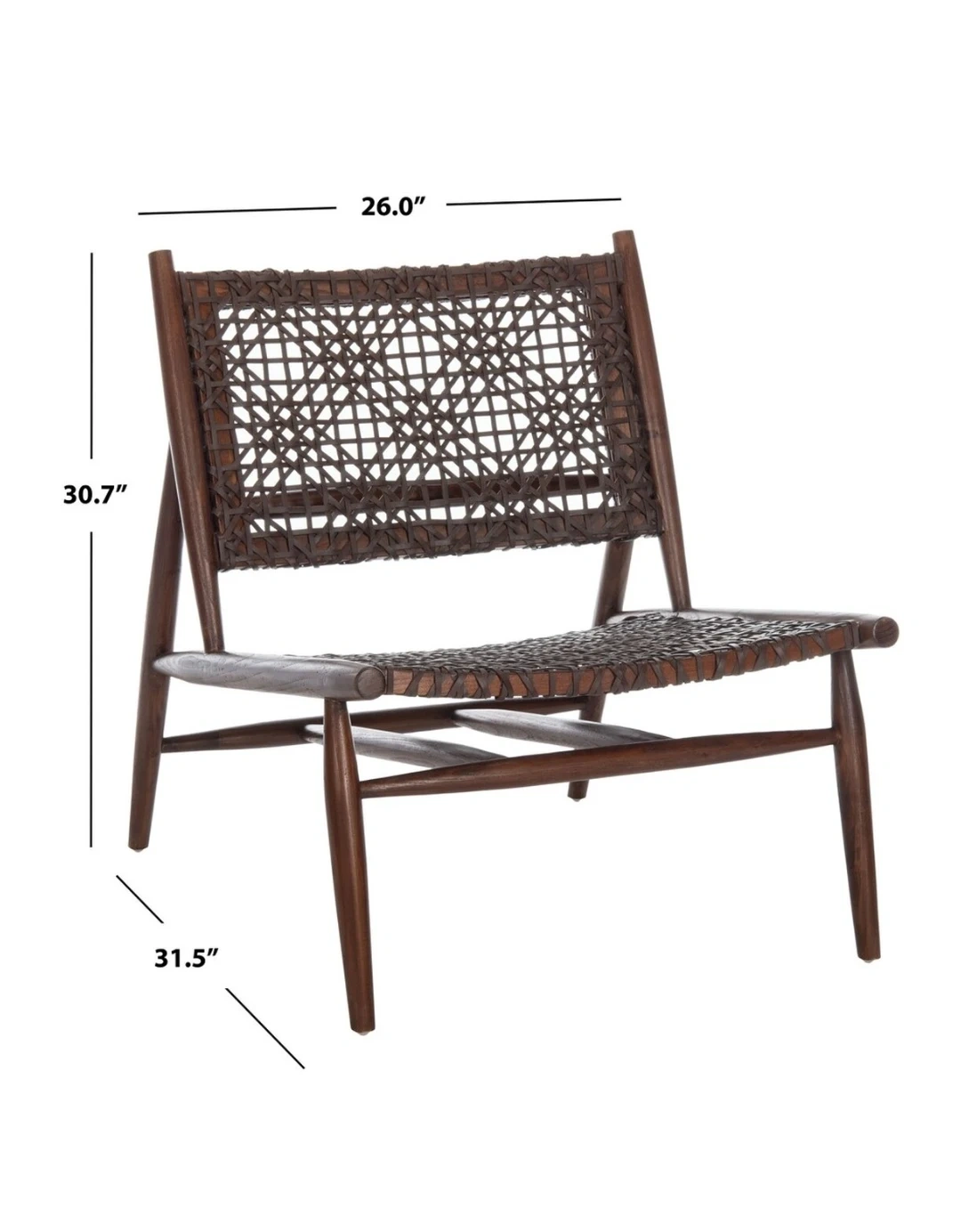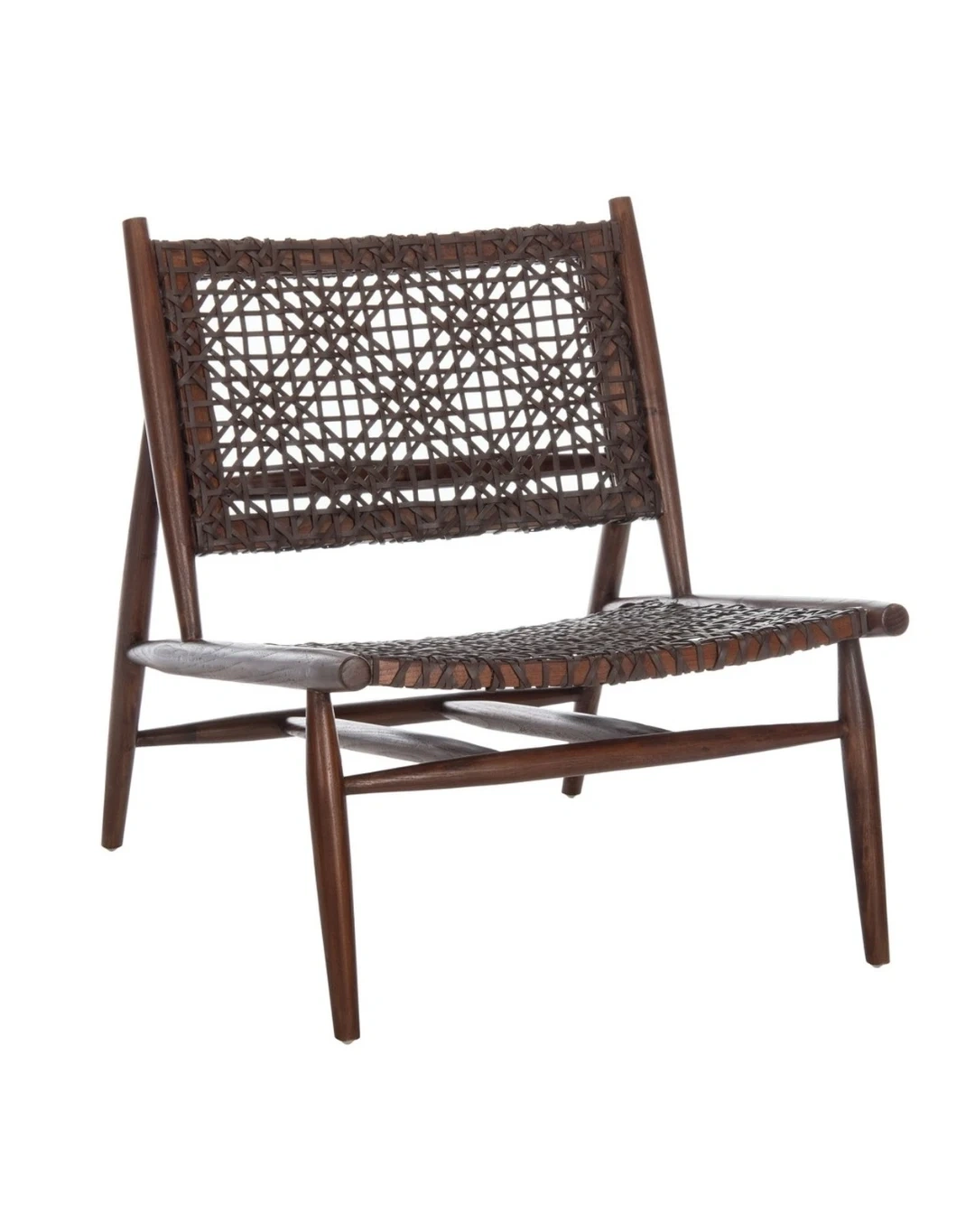 Crafted of beautiful sungkai wood and leather, the Danish-inspired Bandelier Accent Chair from Safavieh features an open, airy design that is sturdy and durable. Cowhide leather strips are woven into a striking pattern that supports up to 275 lb.
