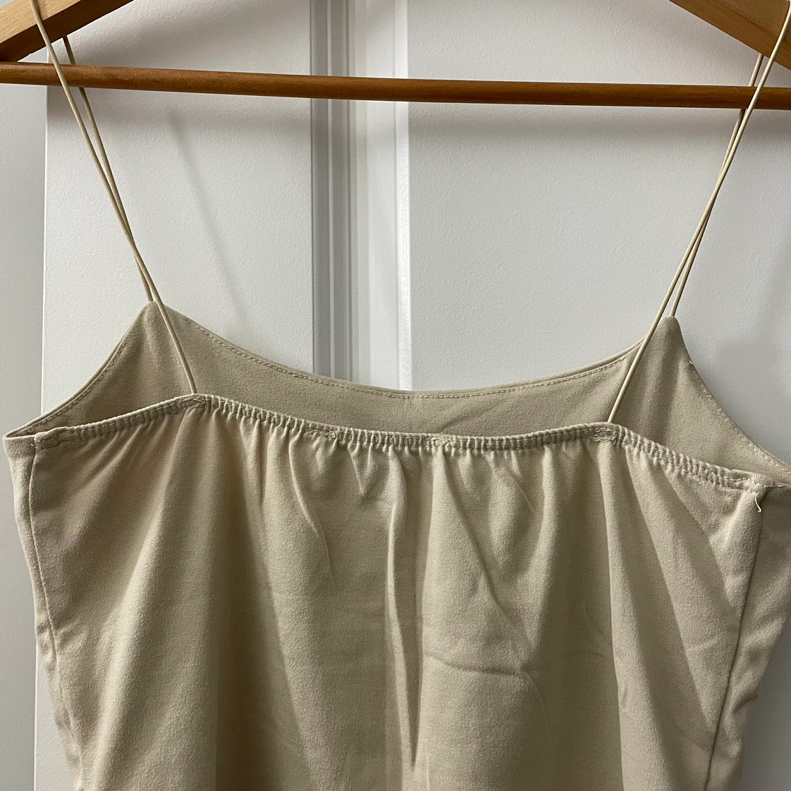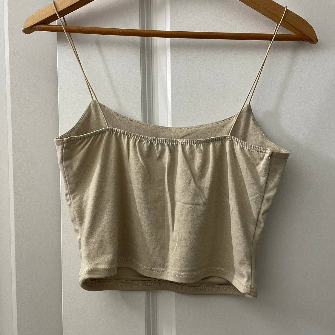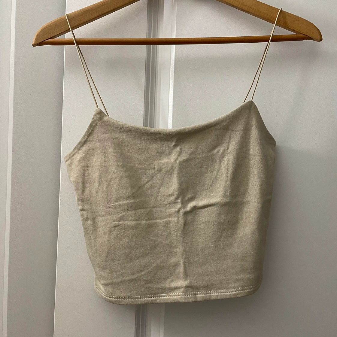 Cropped tank top. Spaghetti straps. Tan/beige colour. Super soft and stretchy, very comfortable. Great for layering or wearing on its own. I’m unfamiliar with the brand, but it was from Winners. Size XS.