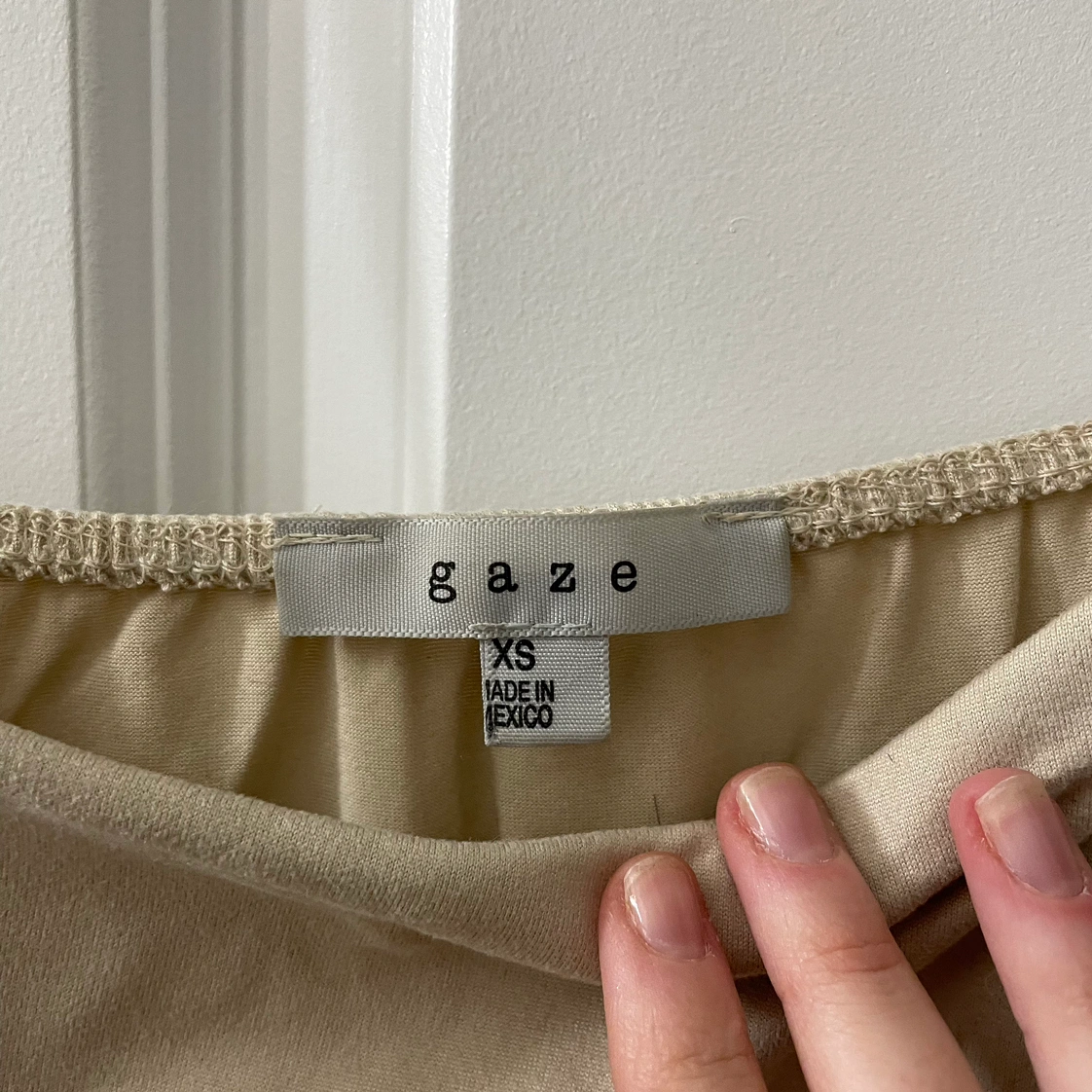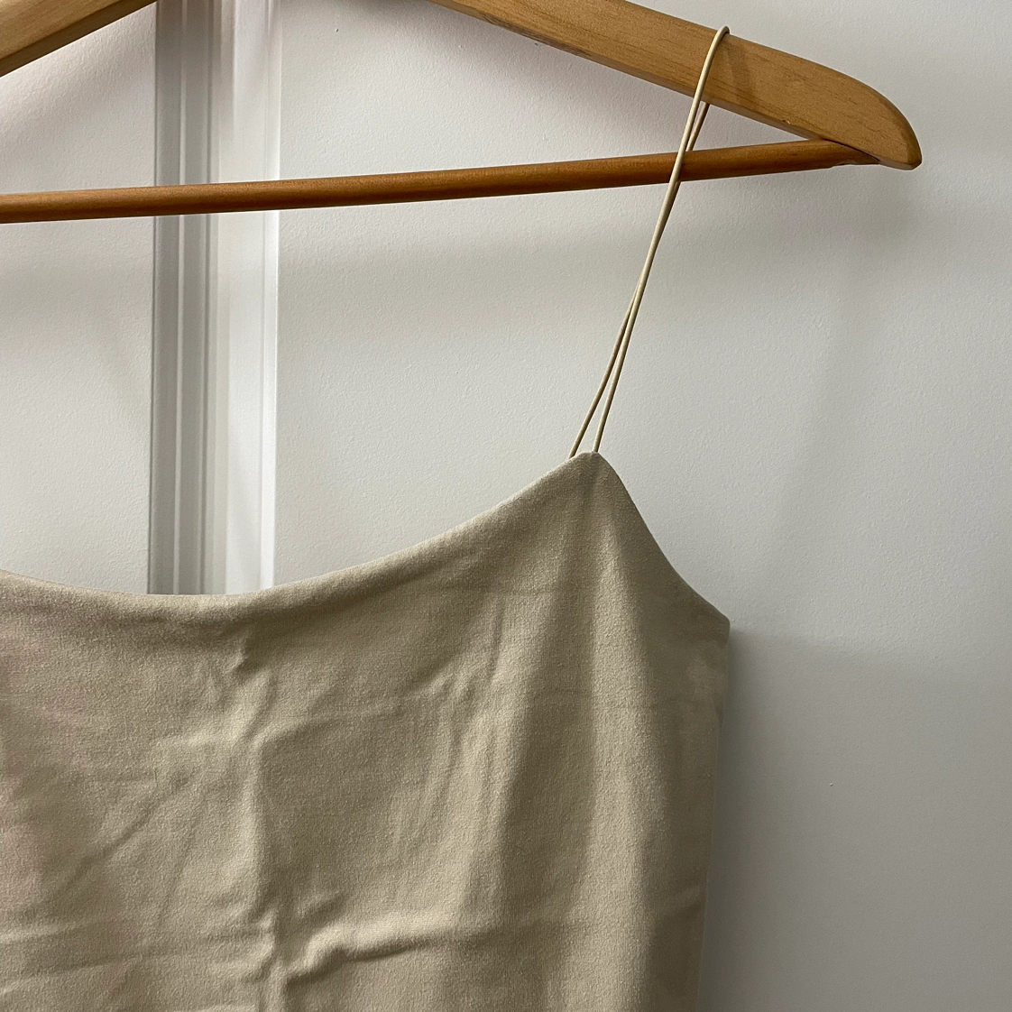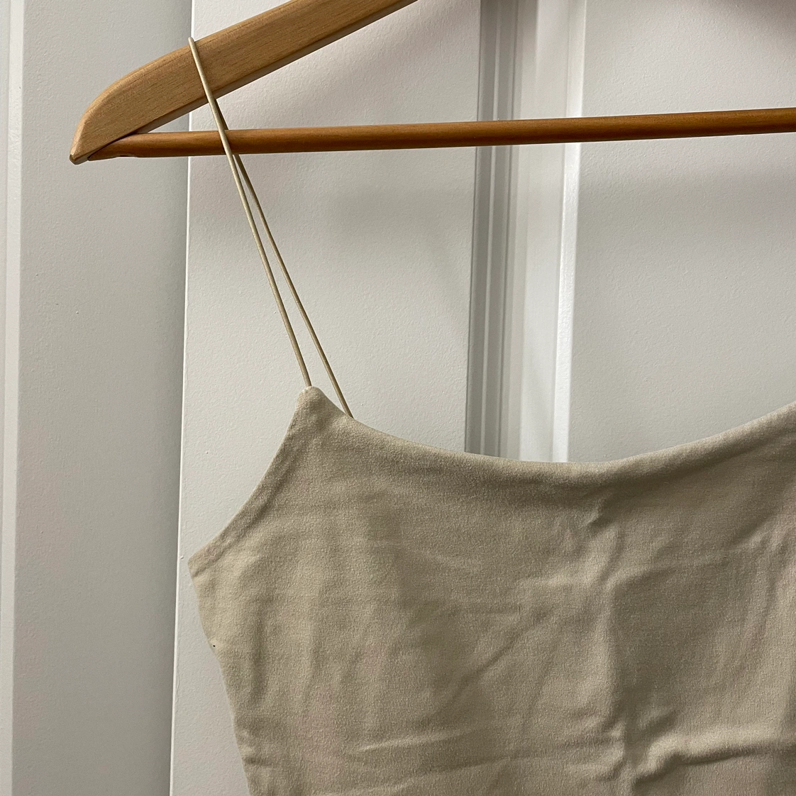 Cropped tank top. Spaghetti straps. Tan/beige colour. Super soft and stretchy, very comfortable. Great for layering or wearing on its own. I’m unfamiliar with the brand, but it was from Winners. Size XS.