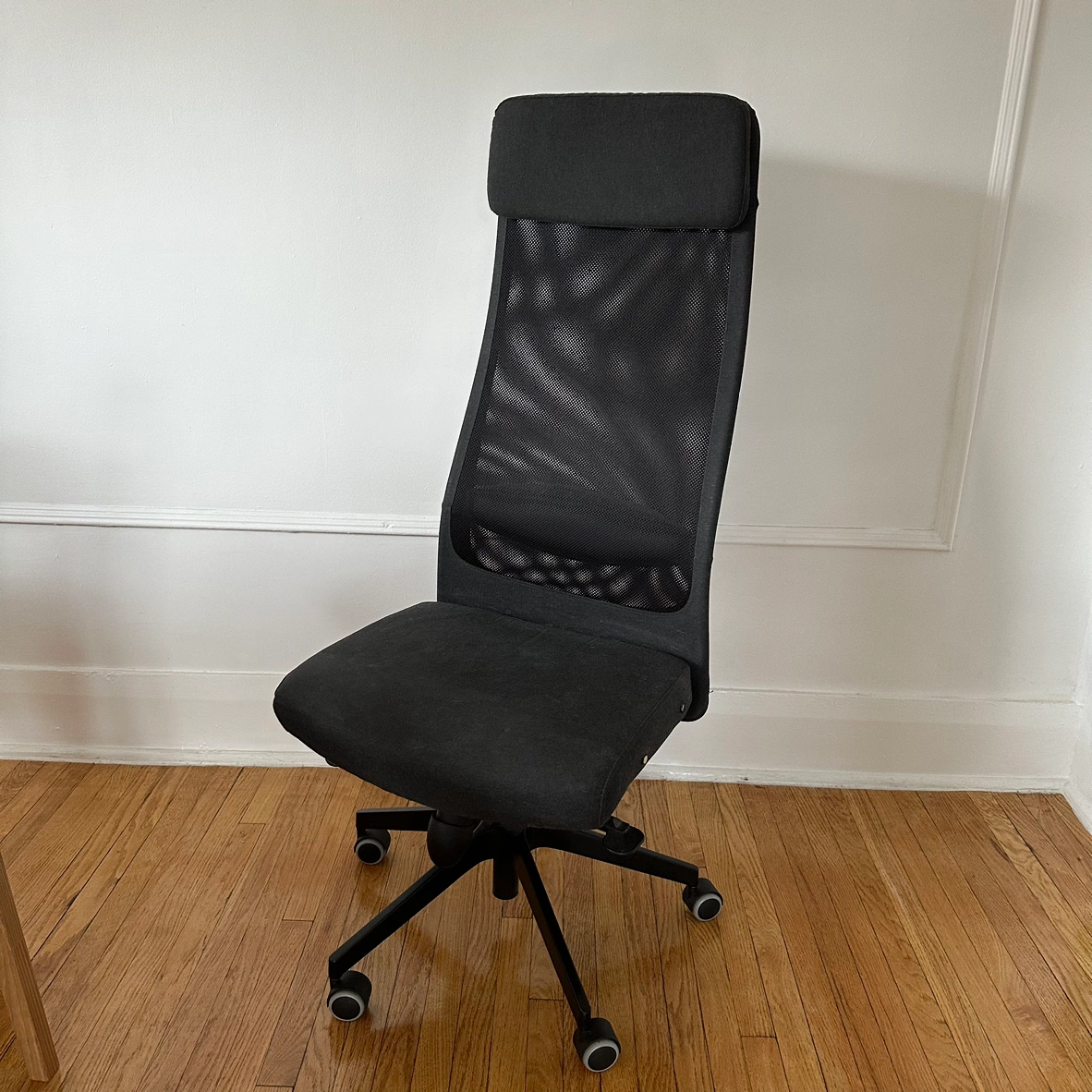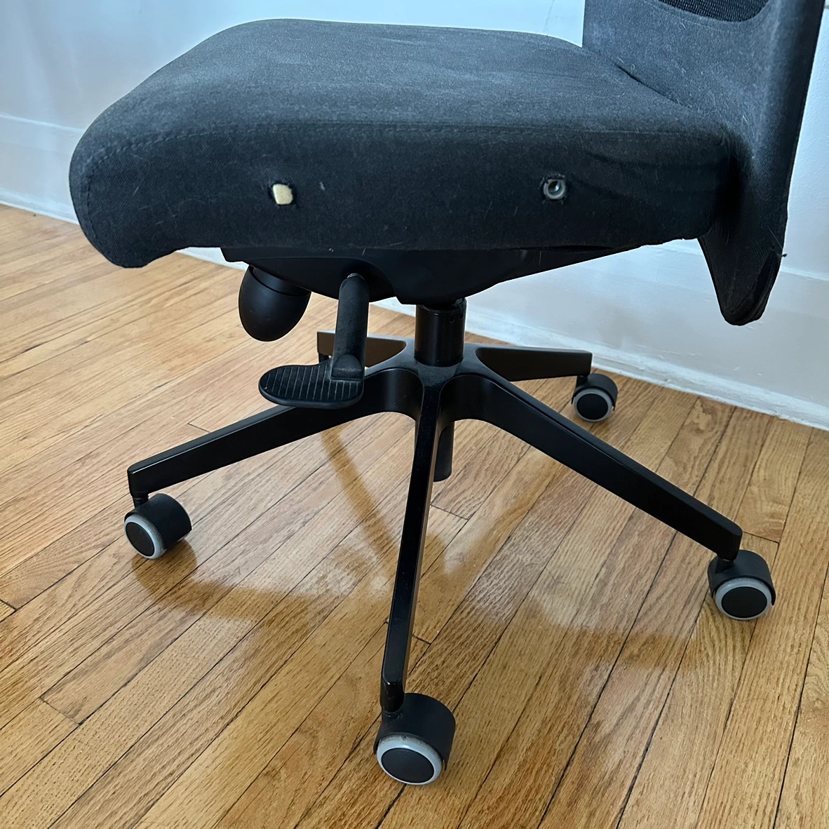 Height-adjustable office chair with wheels, headrest, and a mesh back. Just missing the armrests, but works fine! Got new office chairs so trying to get rid of this one.