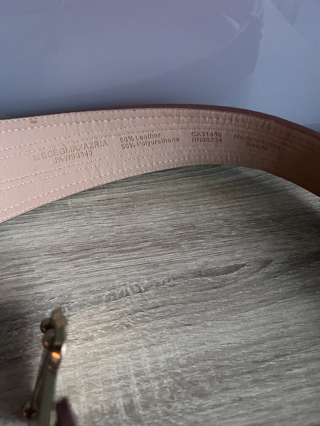 Mint condition leather blend BCBG beige adjustable belt features a gold lock buckle.