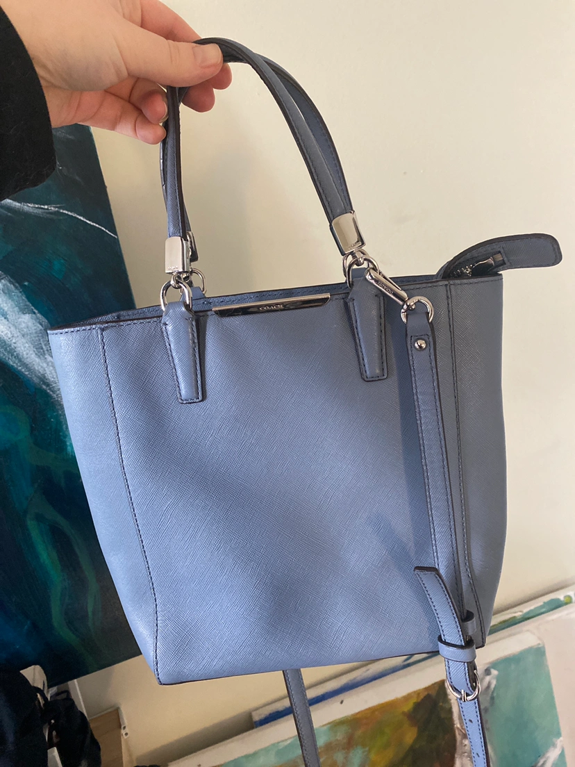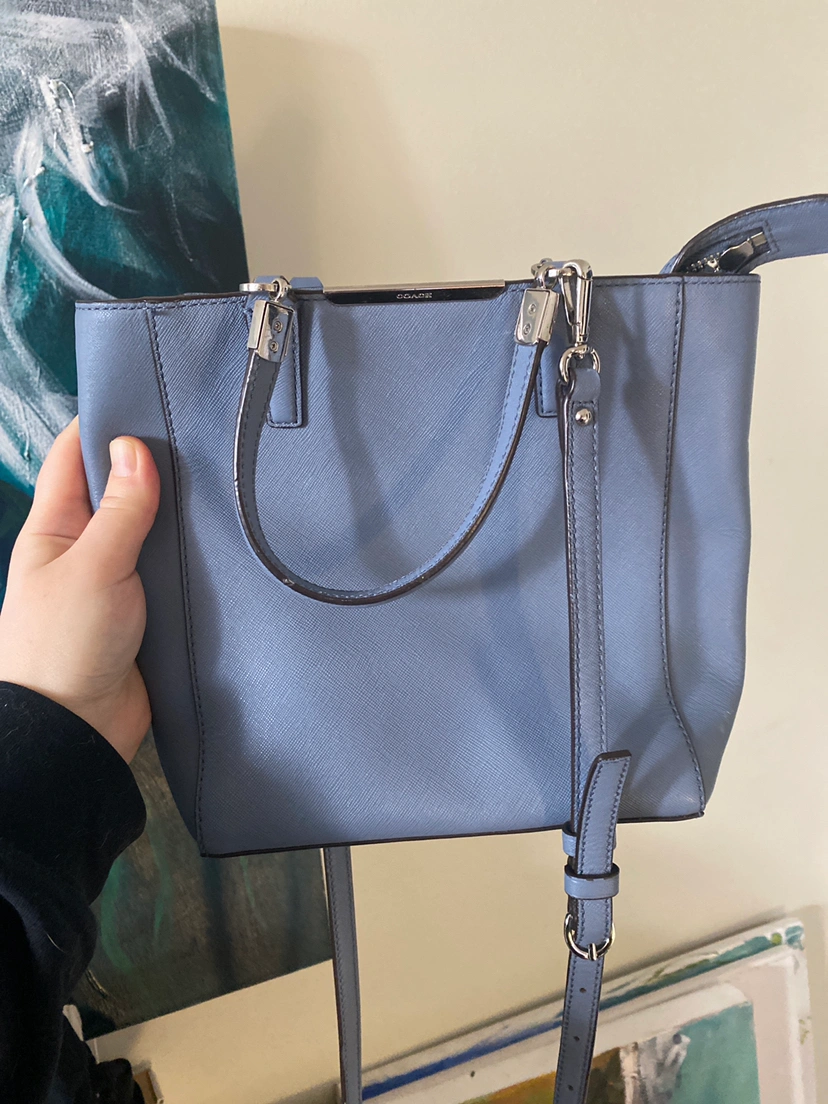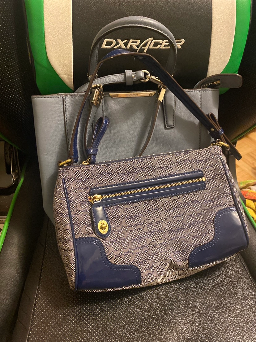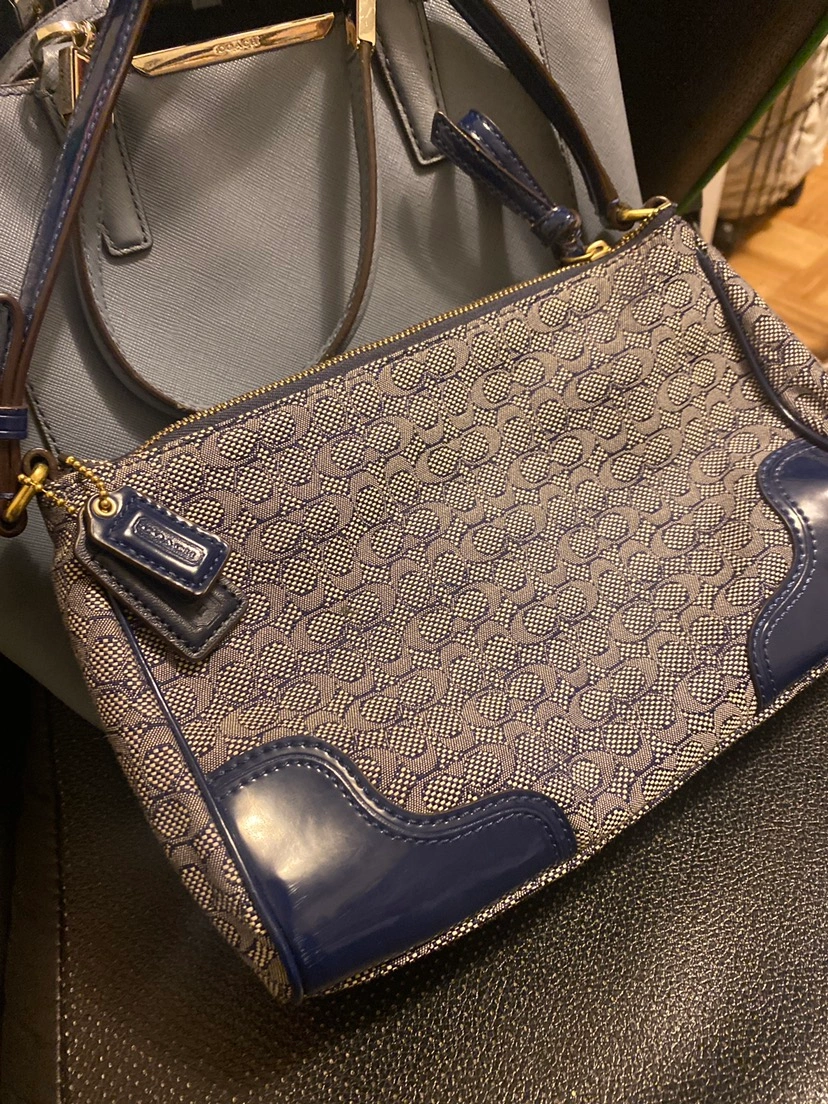 Two coach purses. These were thrifted so not sure whether they are authentic. Light blue purse has long strap to be worn as a crossbody; dark blue is a small shoulder bag. Moving soon and need to get rid of stuff!