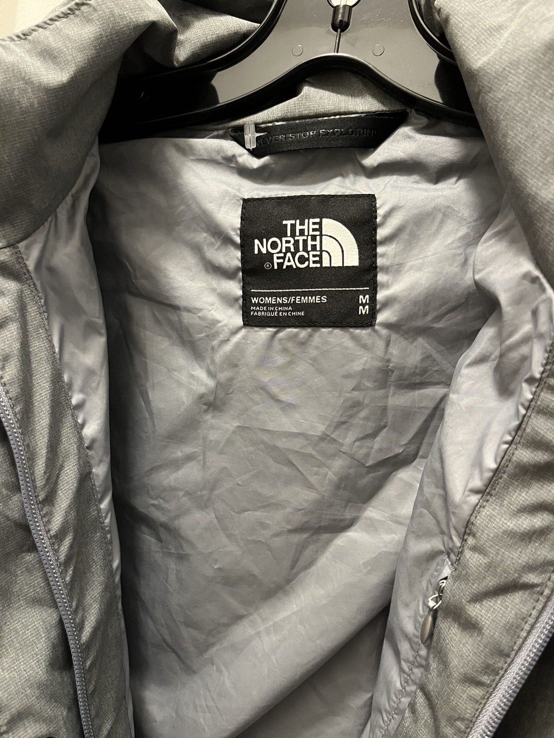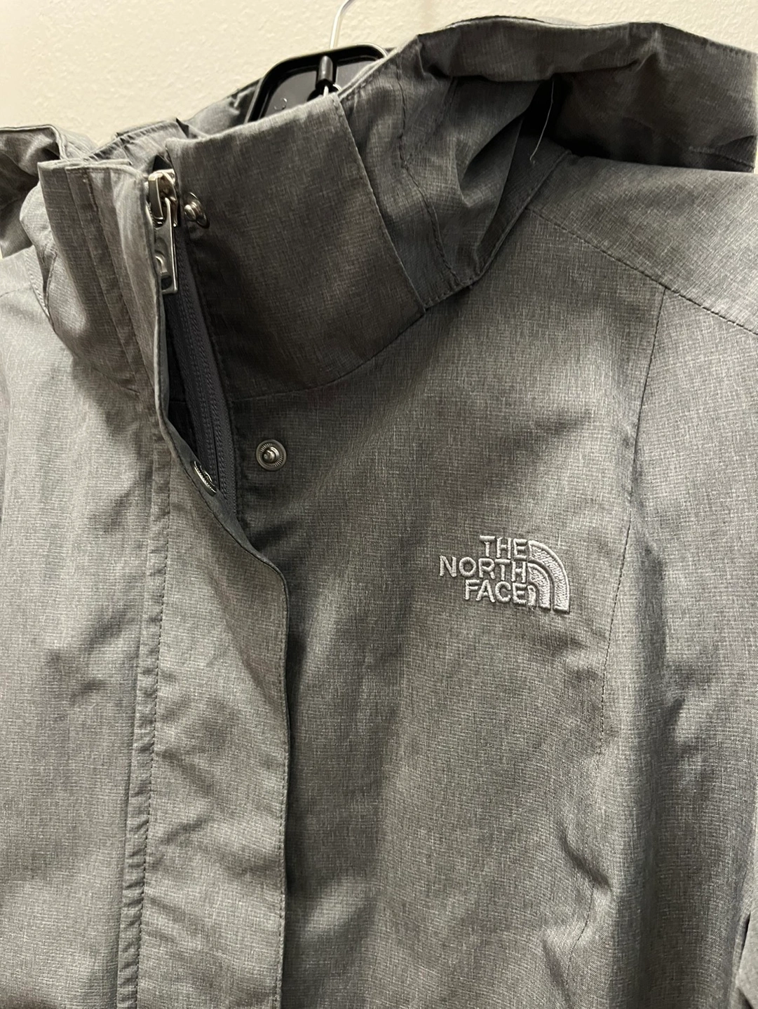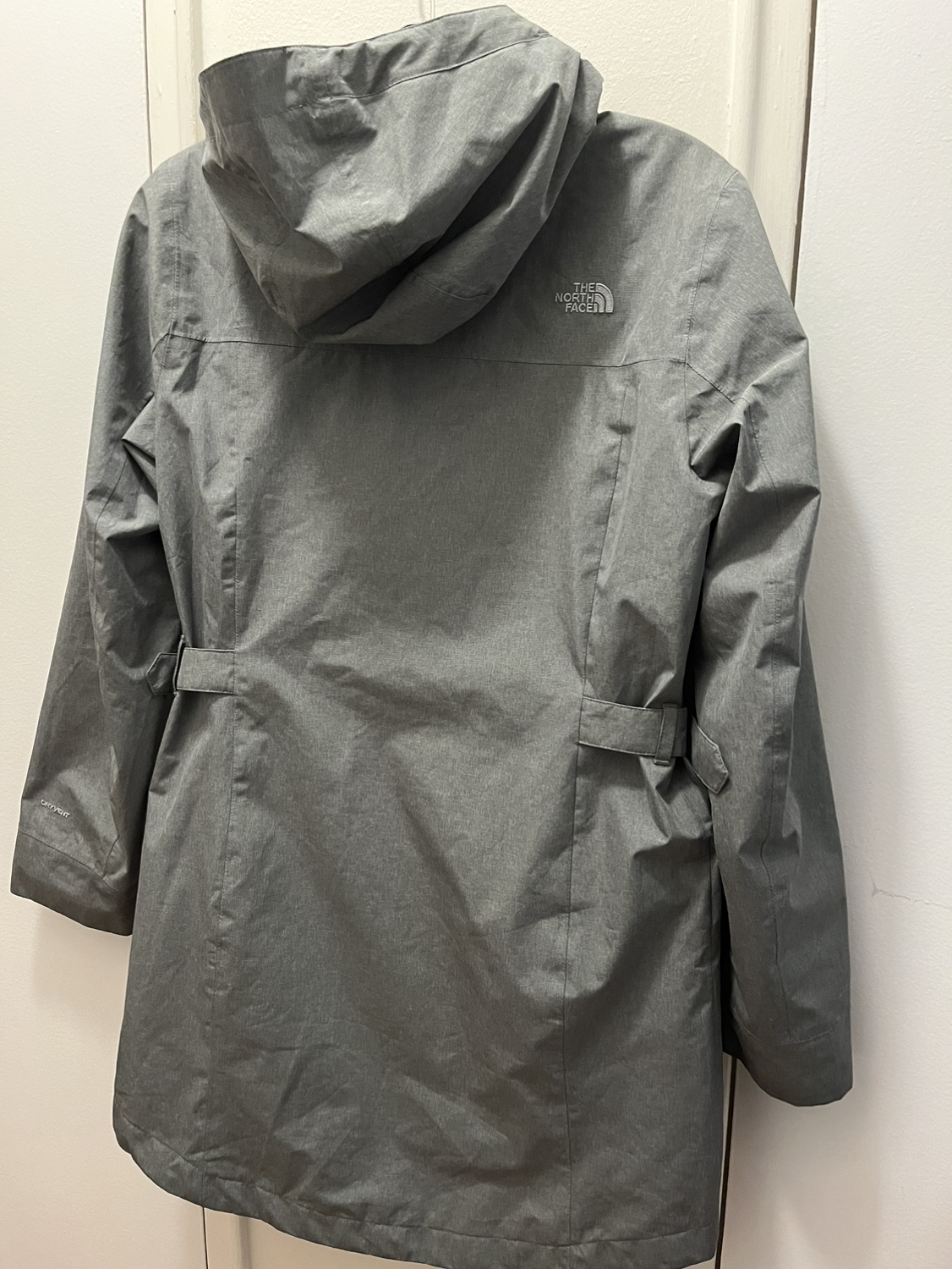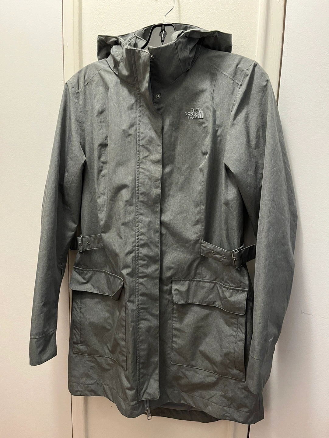 Good condition North Face hooded rain coat in size medium. Light grey. Small stain on sleeve (see pic)