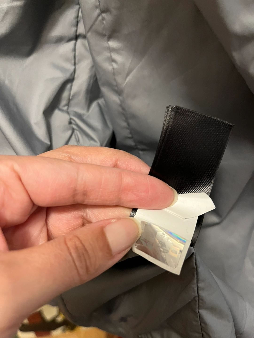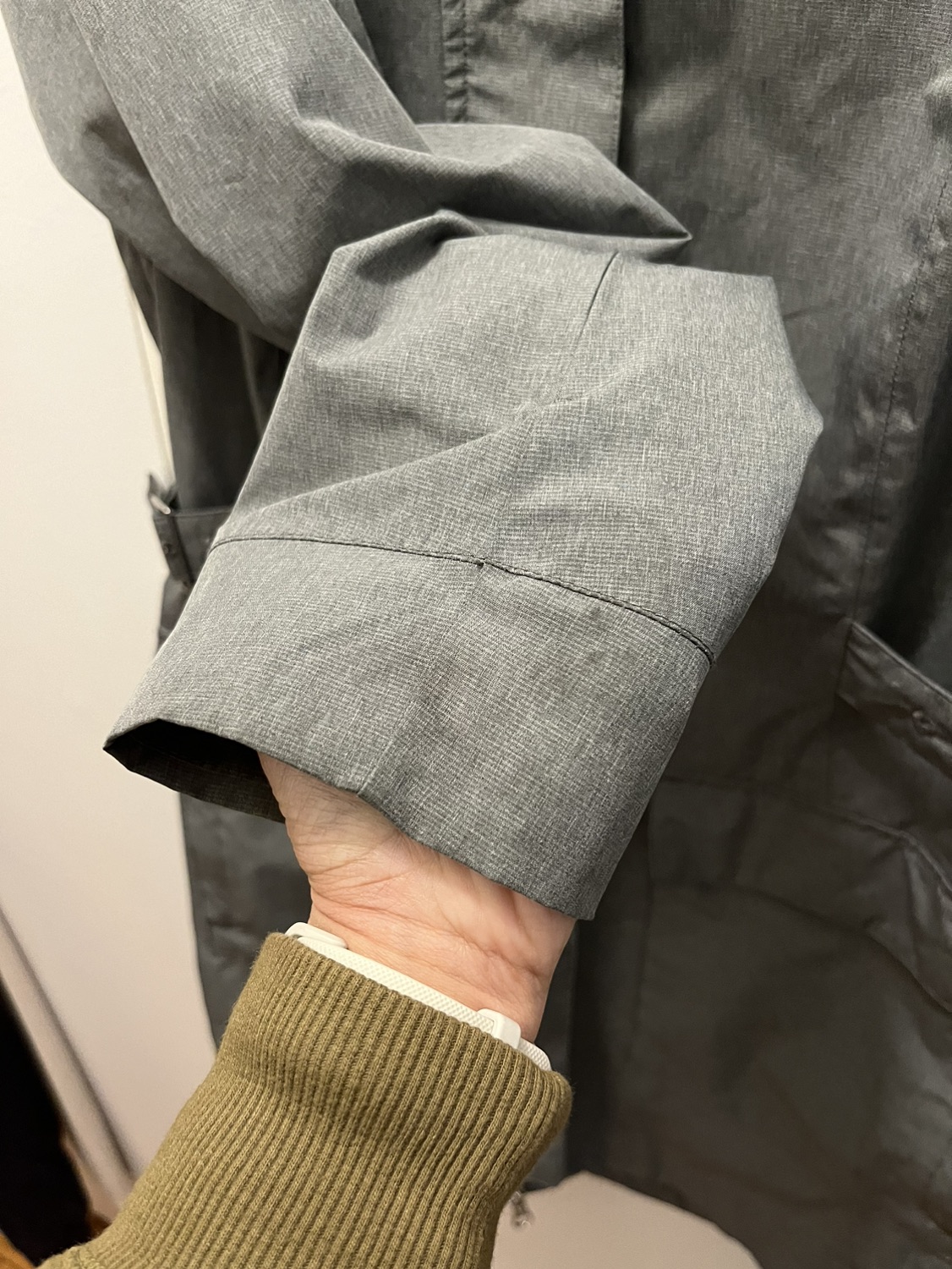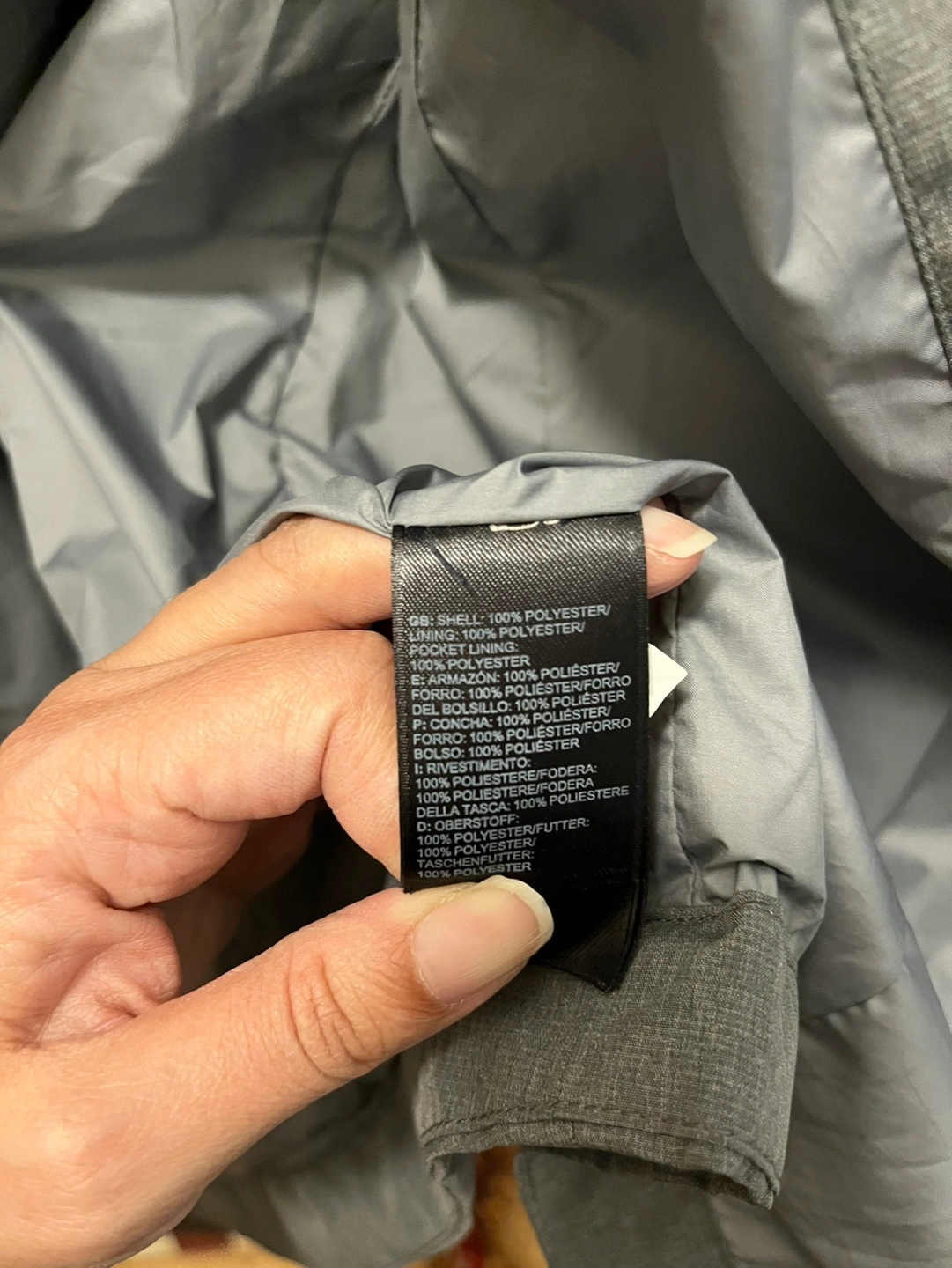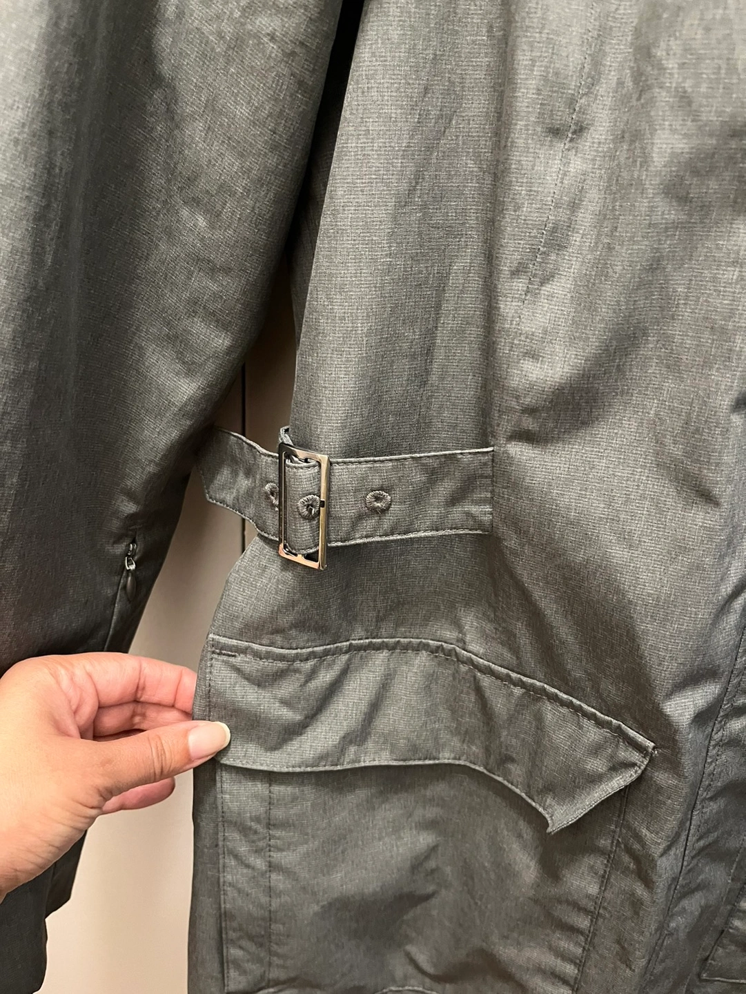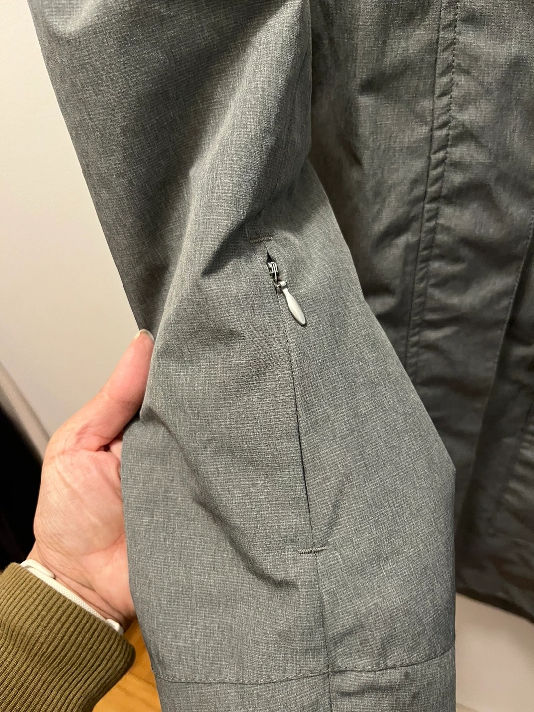 Good condition North Face hooded rain coat in size medium. Light grey. Small stain on sleeve (see pic)