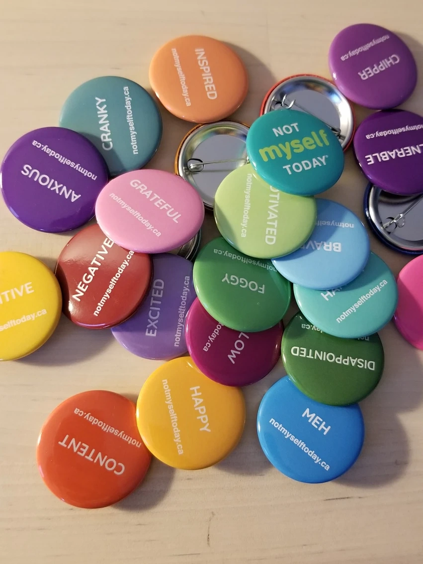 Collection of pinback buttons with different emotions on each, various colors. 24 different emotions plus one Not Myself Today button.