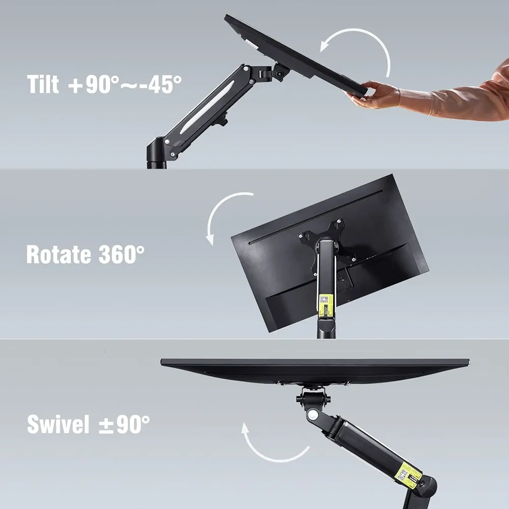 FULL MOTION FEATURES: The single monitor mount features full motion flexibility including +90°/-45° tilt to reduce glare, 180° swivel to direct the screen toward your position, and 360° rotation for landscape or portrait mode.