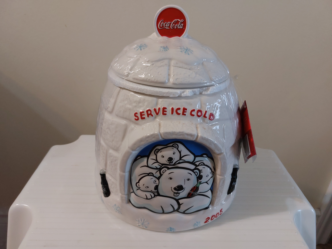 608ATTENTION COCA COLA LOVERS! Brand New with Tag Vintage 2005 Coca Cola Igloo "Serve Ice Cold" cookie jar, still has orginal cellophane wrapping Pickup at Yonge Street and 16th Ave
