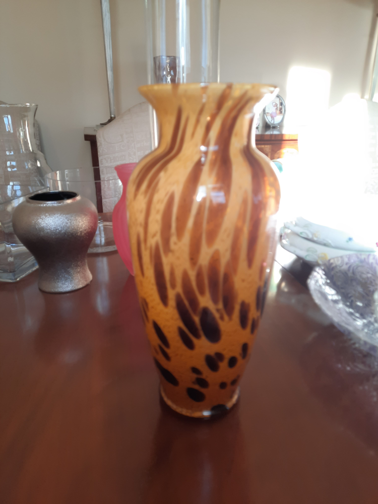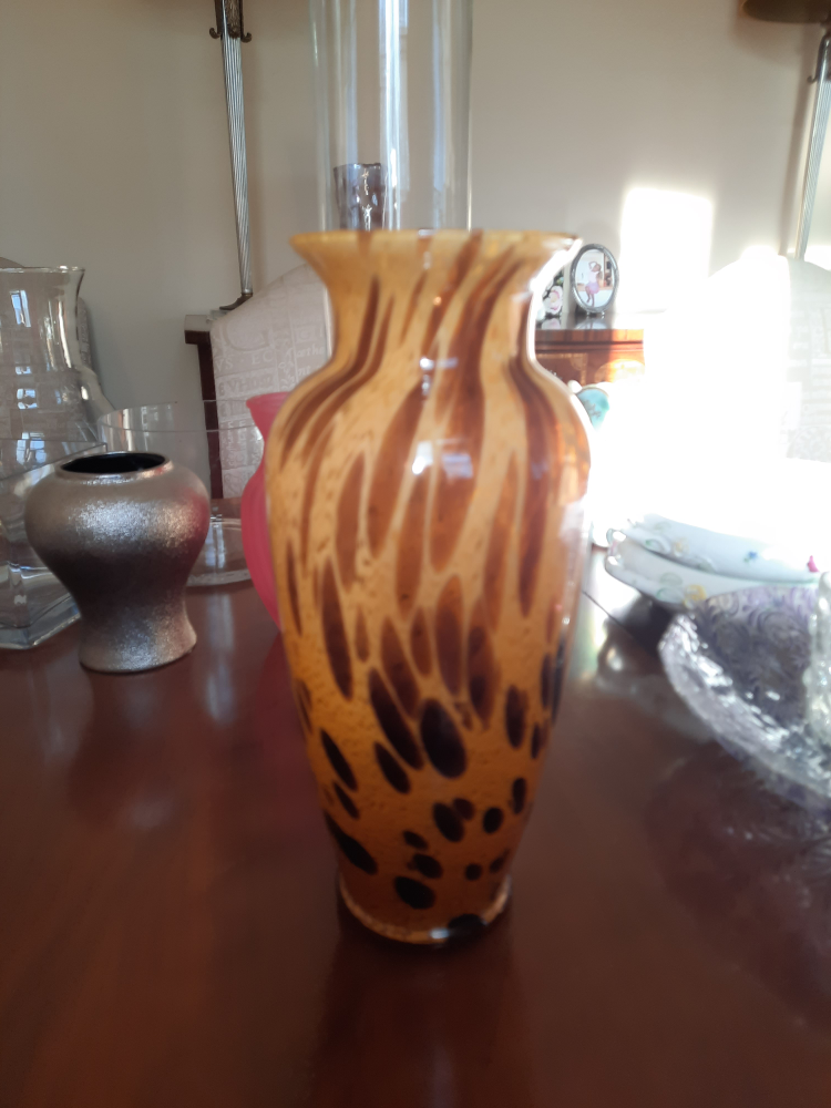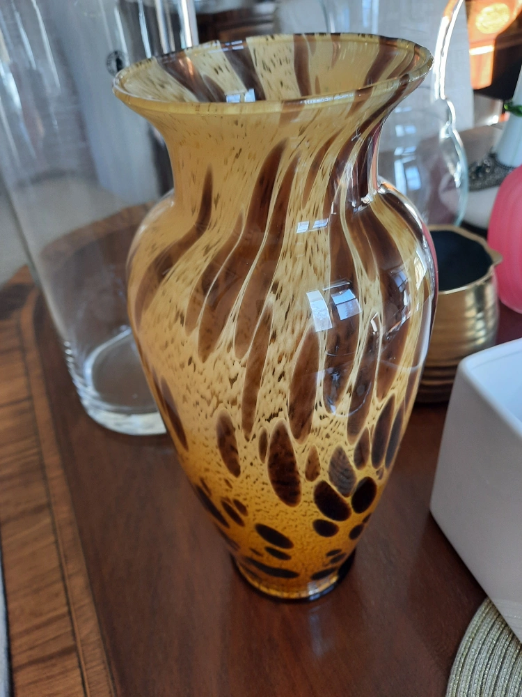 stunning hand blown, leopard print vase. Can be used as decorative piece or for floral arrangement