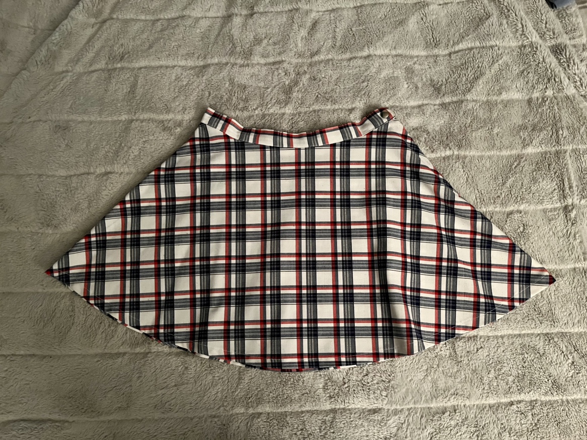 Size M. Snap button and side zipper closure. White/blue/red. The classic AA circle skirt. Super cute and flattering.