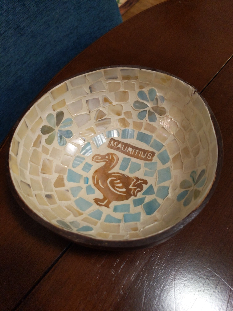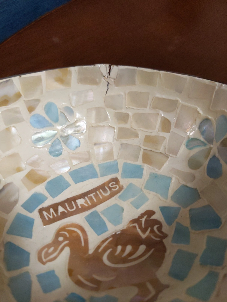 Beautiful handmade mosaic tiles of the famous dodo bird on a coconut shell. Nice display souvenir piece from Mauritius island. Free because of small chip