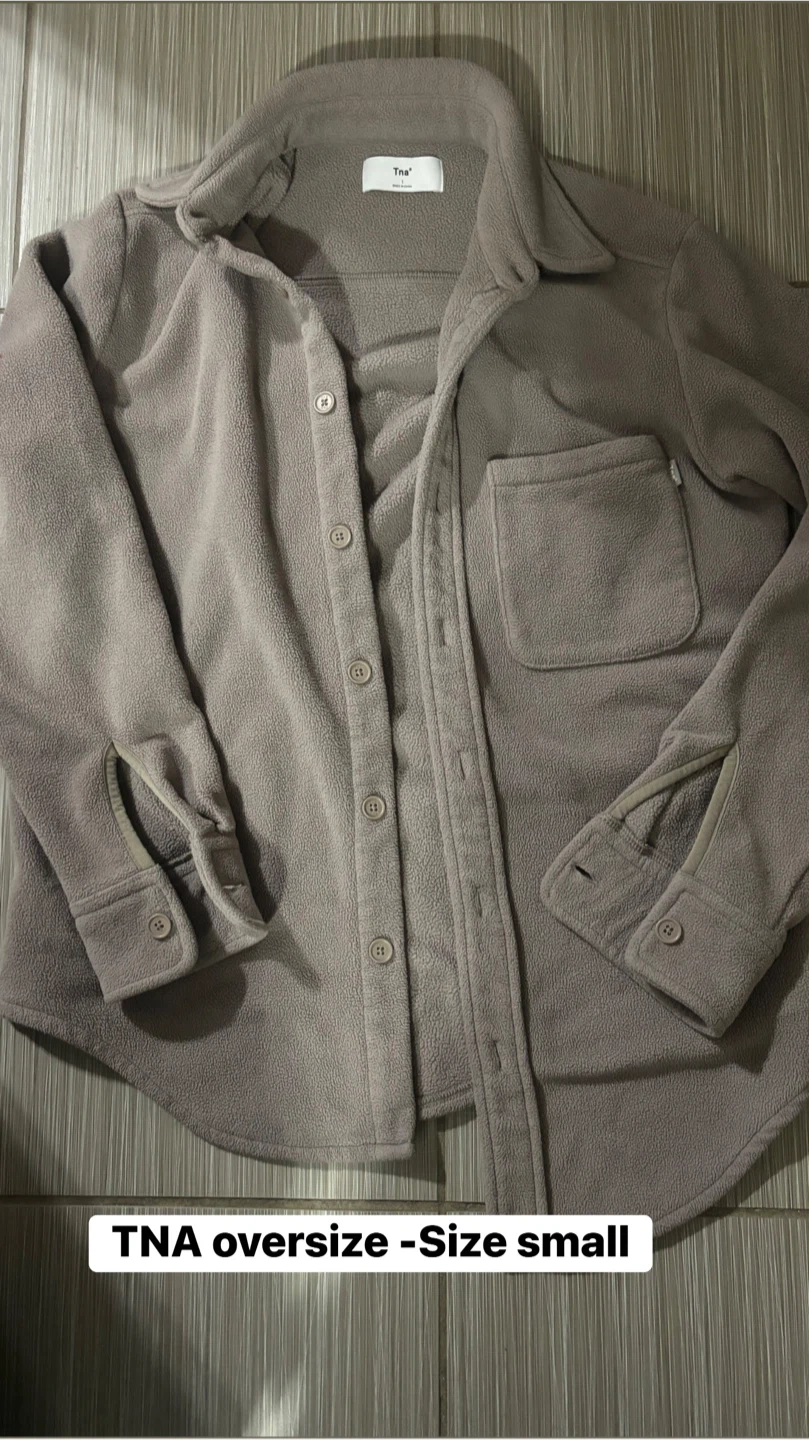 This is a TNA oversized fleece shirt in a neutral taupe colour. It's a size small with button closures and a chest pocket. Perfect for layering on cooler days!