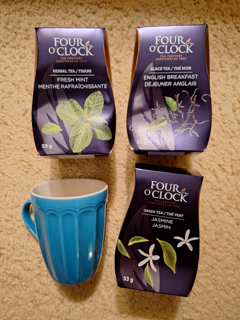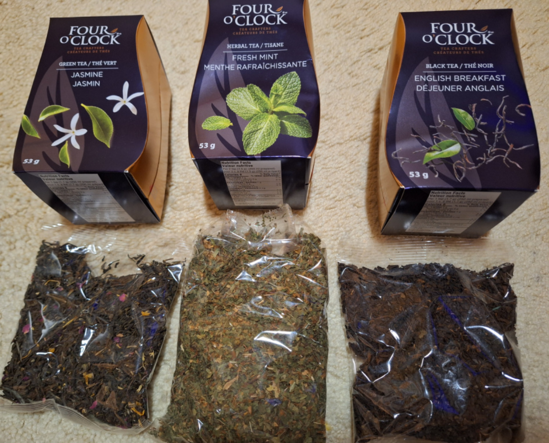 389Four O'clock Tea Leaves (Mint, Jasmine, English Breakfast) and a mug. All brand new. Cash only please Pick up at Fairview Mall (T&T Supermarket)