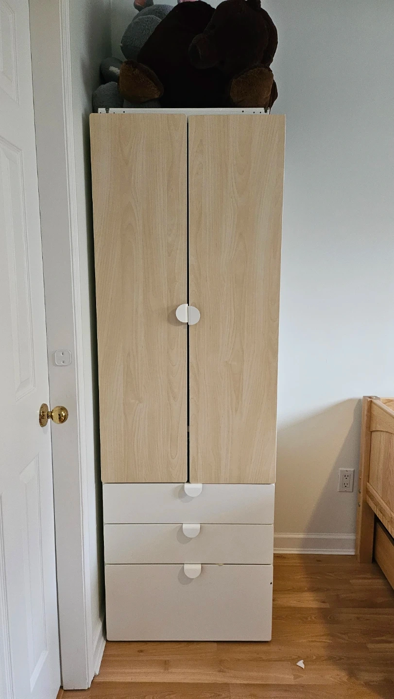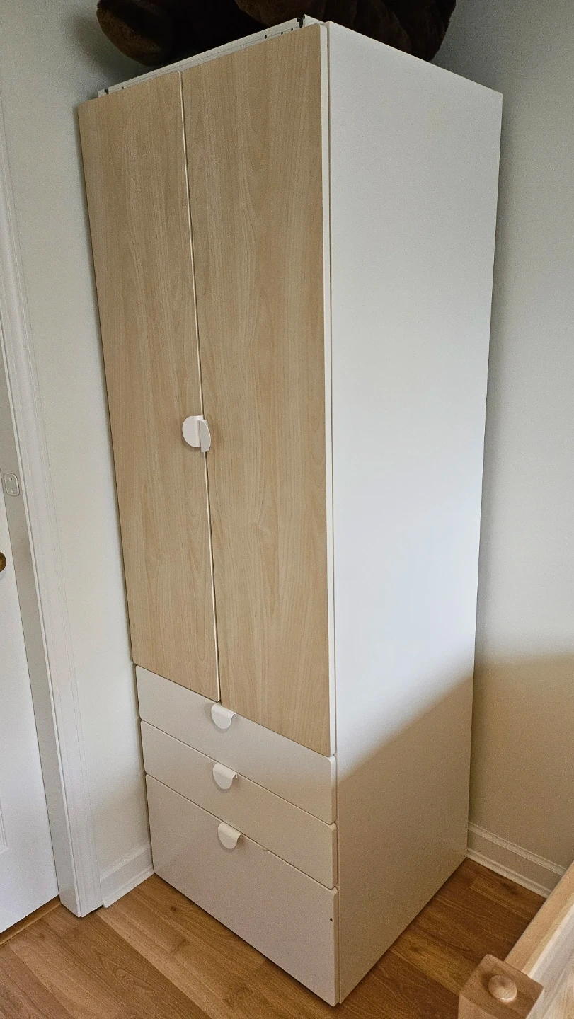 This IKEA Smastad wardrobe is perfect for organizing kids clothes and accessories. It features 2 doors, 3 spacious drawers for ample storage, 1 hanger bar, and a basket drawer