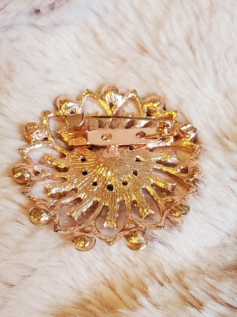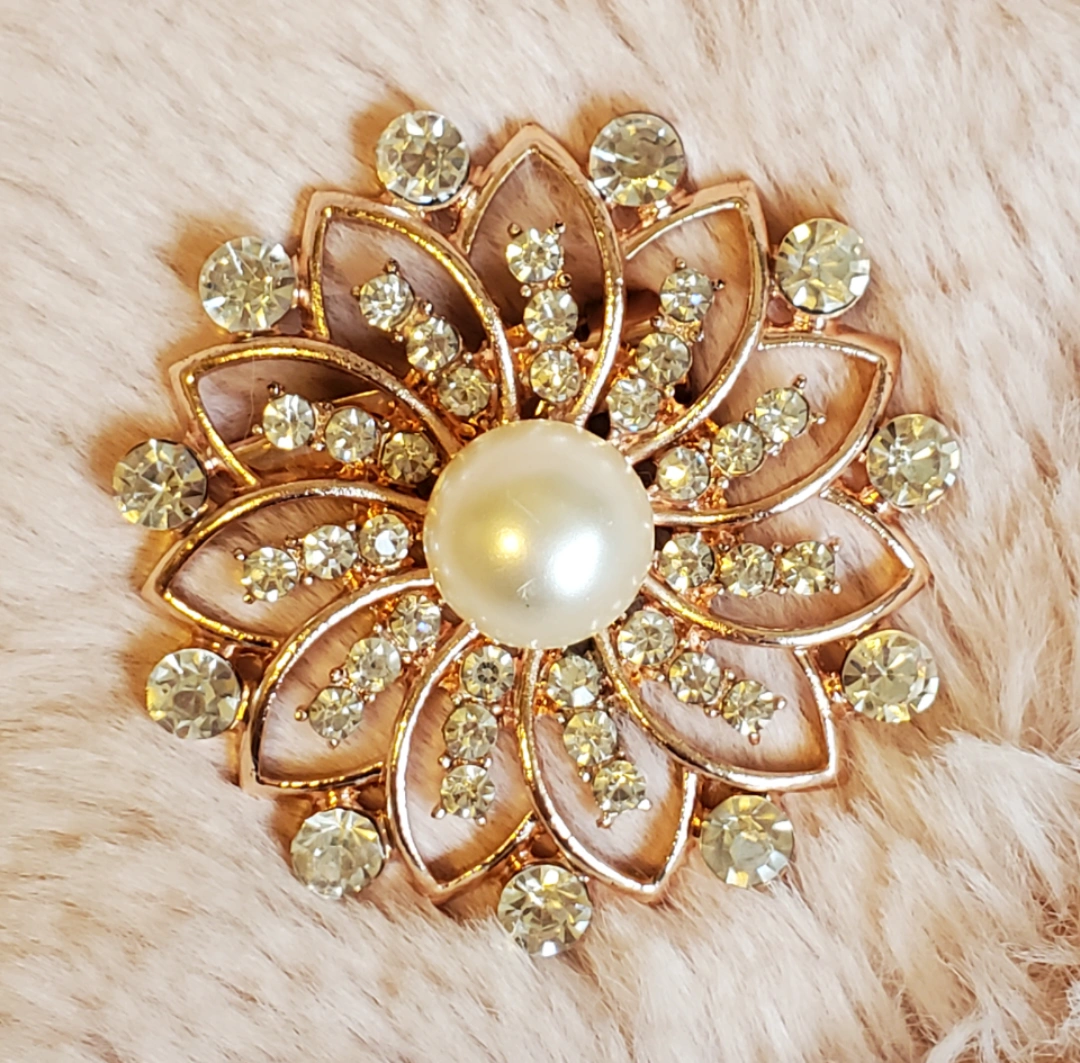Beautiful brooch with crystal stones and a center pearl set in a rose gold metal base.
