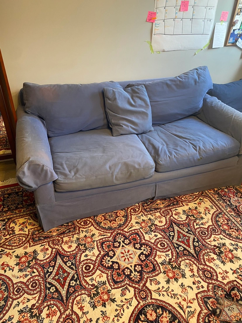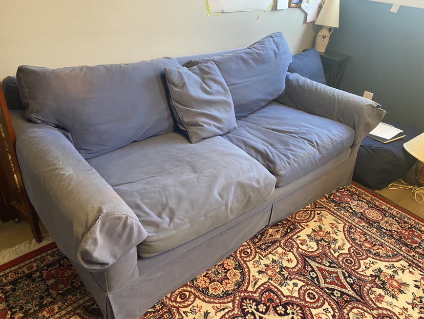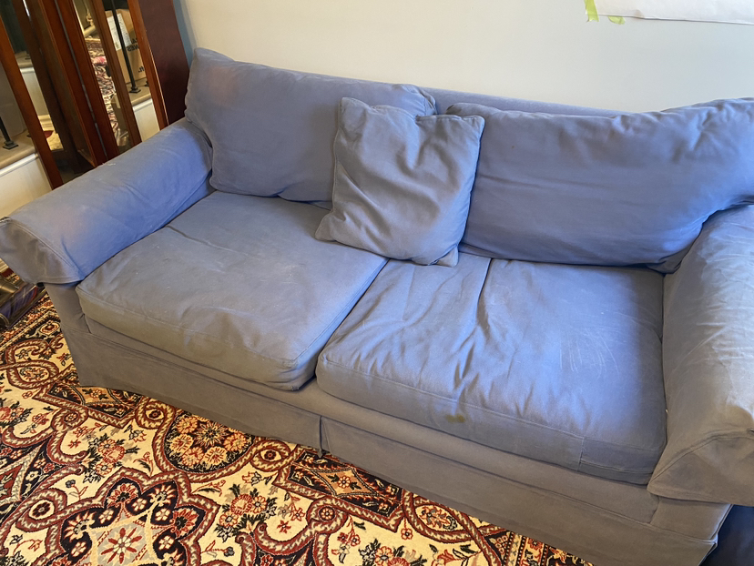 Large, comfortable loveseat. Was custom made. Colour has faded some spots, but is in very good condition otherwise