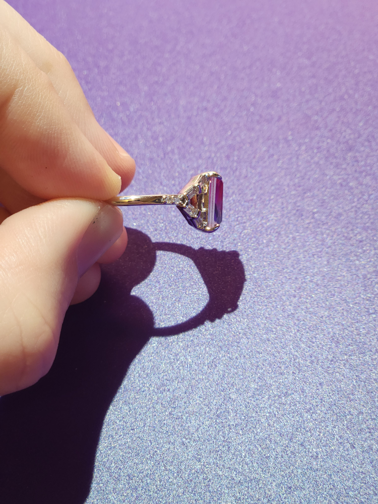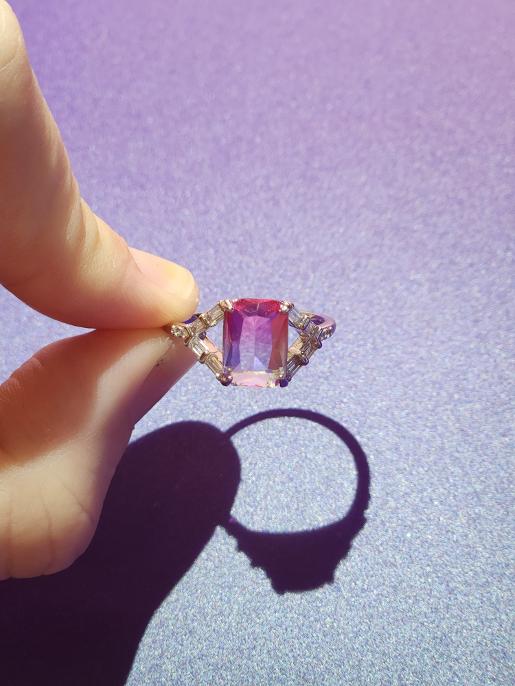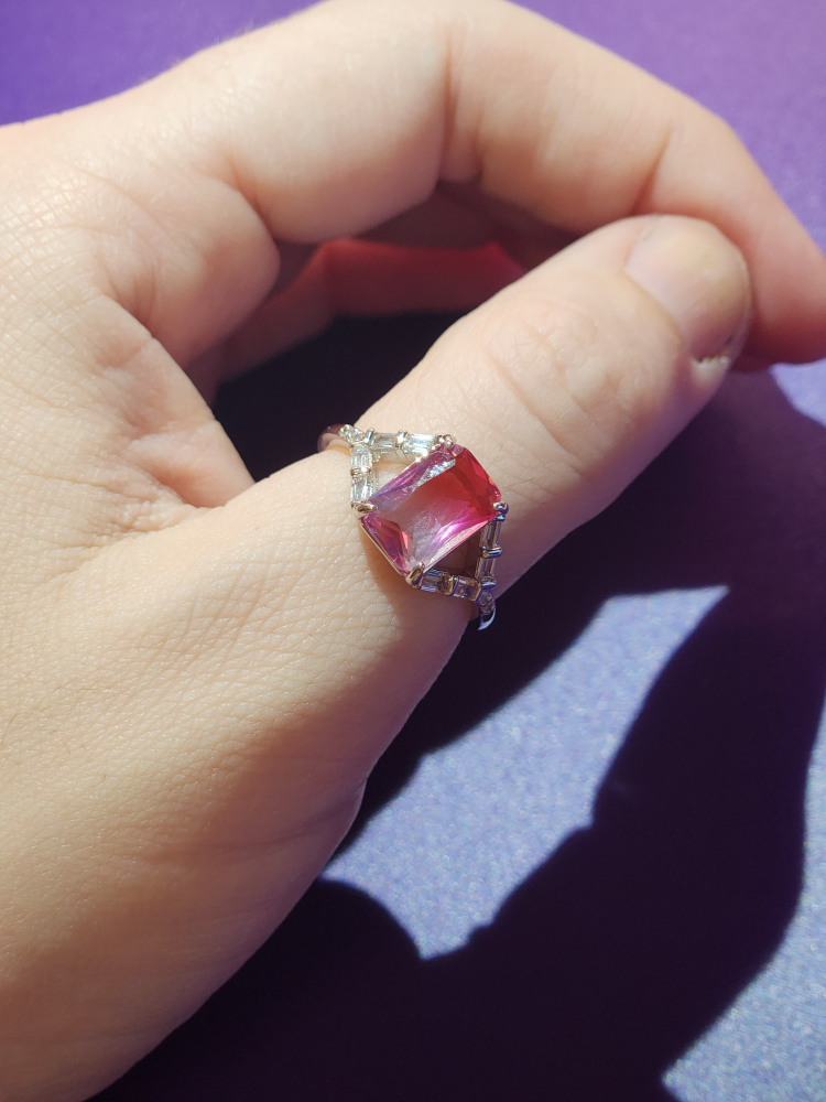 Pink to clear rainbow CZ main stone with clear CZ's surrounding on rhodium plating. All stones in tack and no scratches.