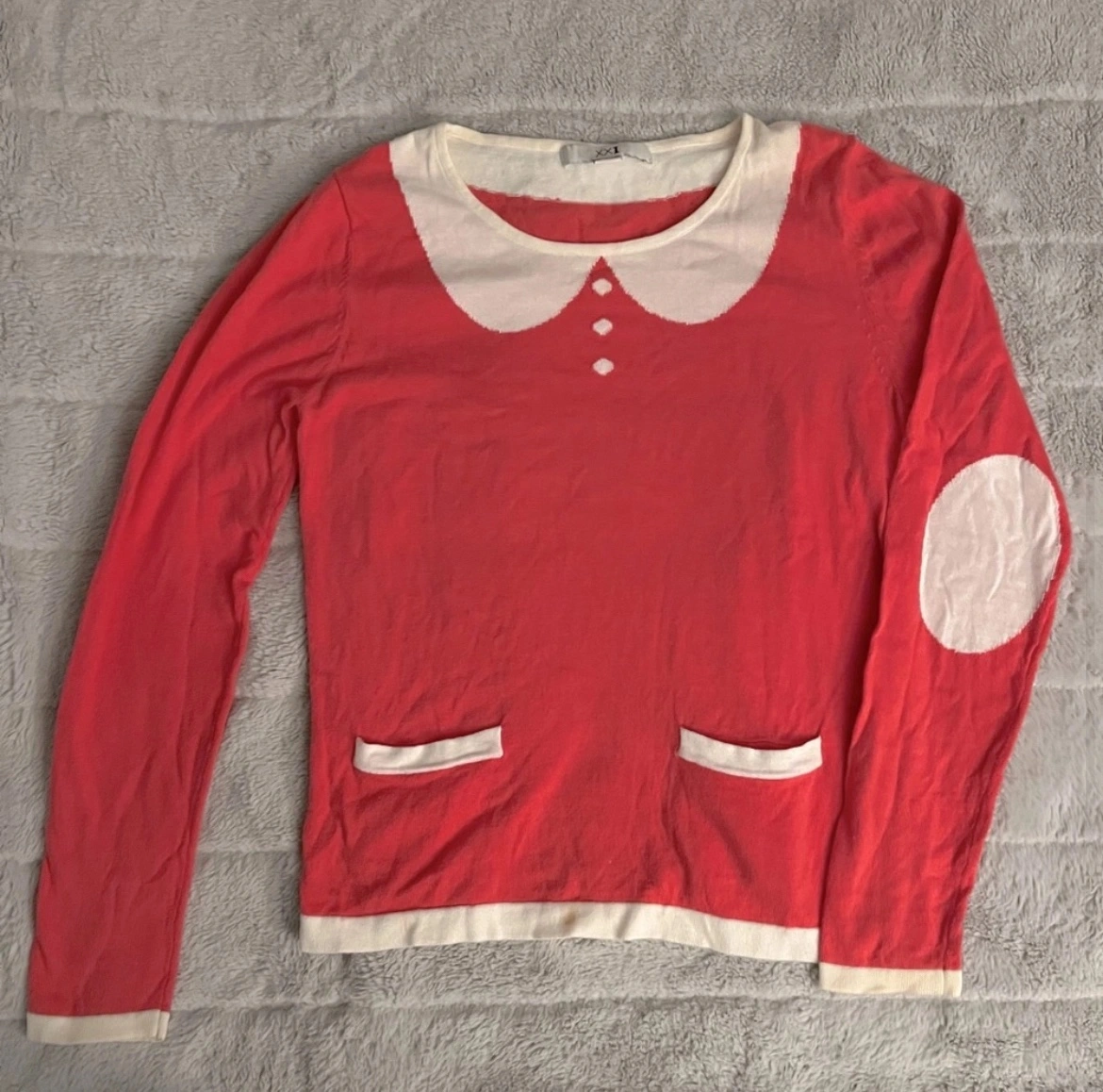 Size M. The cutest Trompe-l'œil sweater – gives the illusion of a collar and buttons at the neckline and elbow patches on the sleeves! It’s a light/thin knit sweater, peachy coral colour with white trim. The pockets are real!