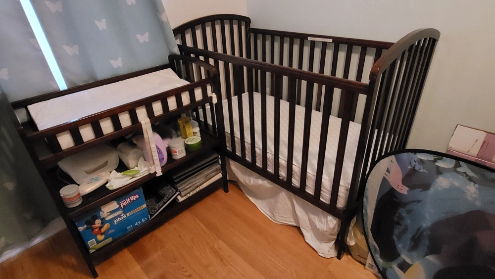 Crib is height adjustable (3 heights) and can be converted to toddler daybed. Comes with Safety 1st 2-stage (newborn to 12m, toddler 12m+) mattress, mattress protector, and crib skirt.