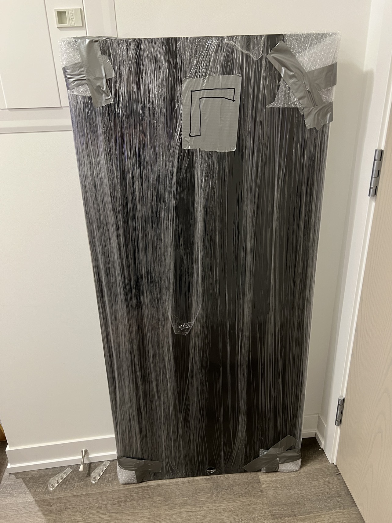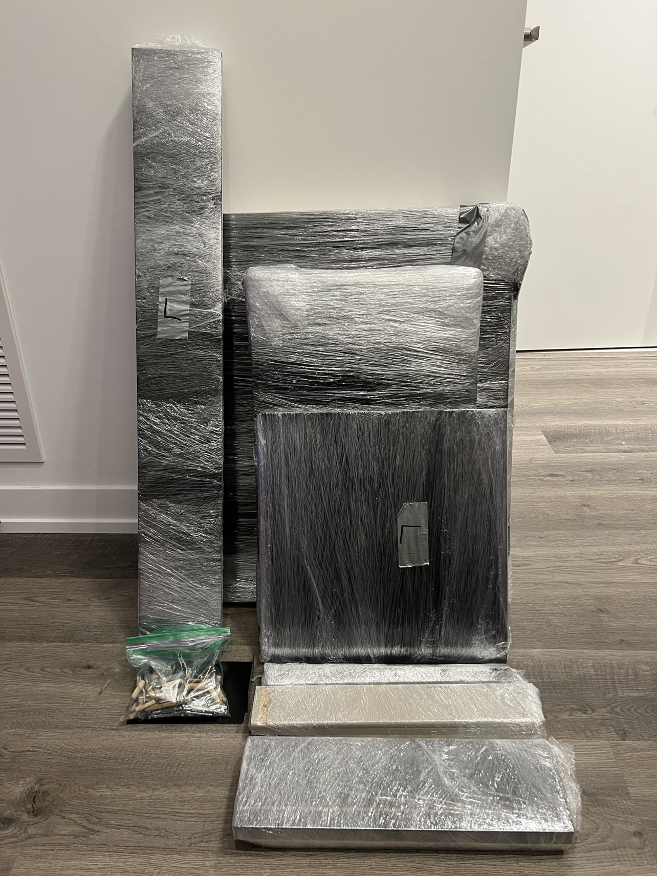 Everything is disassembled and wrapped in plastic wrap for when I was still moving a couple weeks ago (the “L”s just meant living room for my movers).