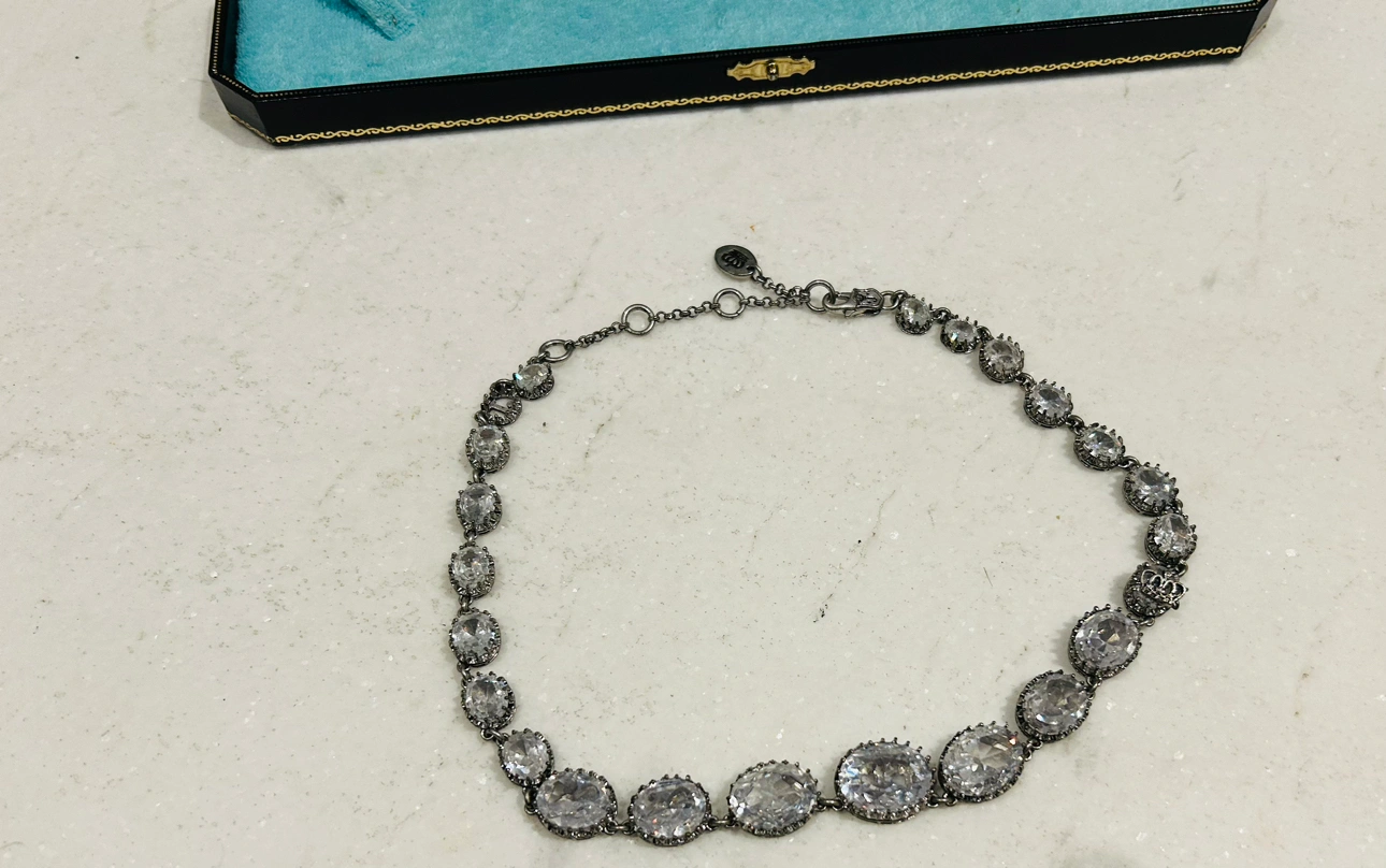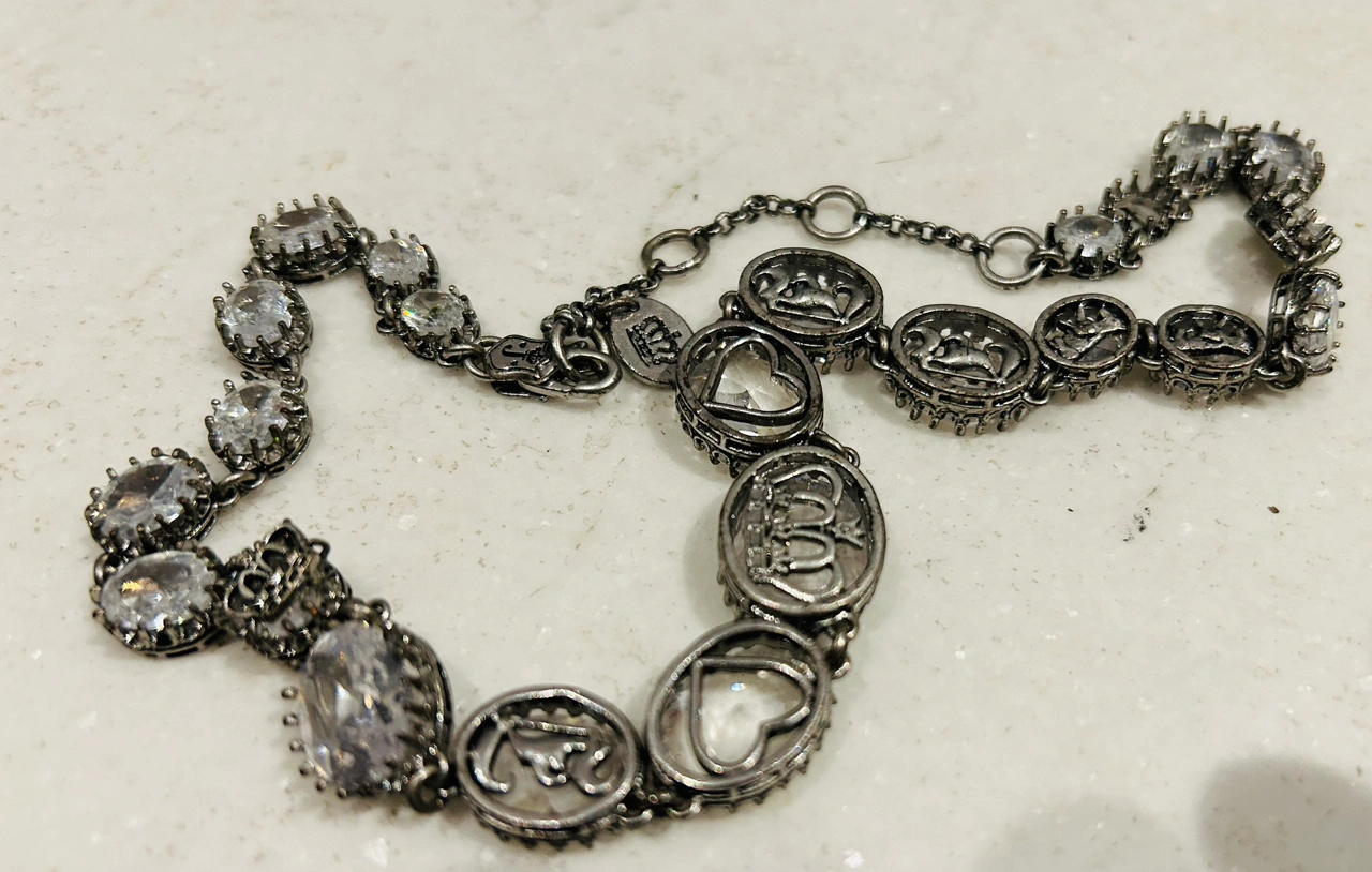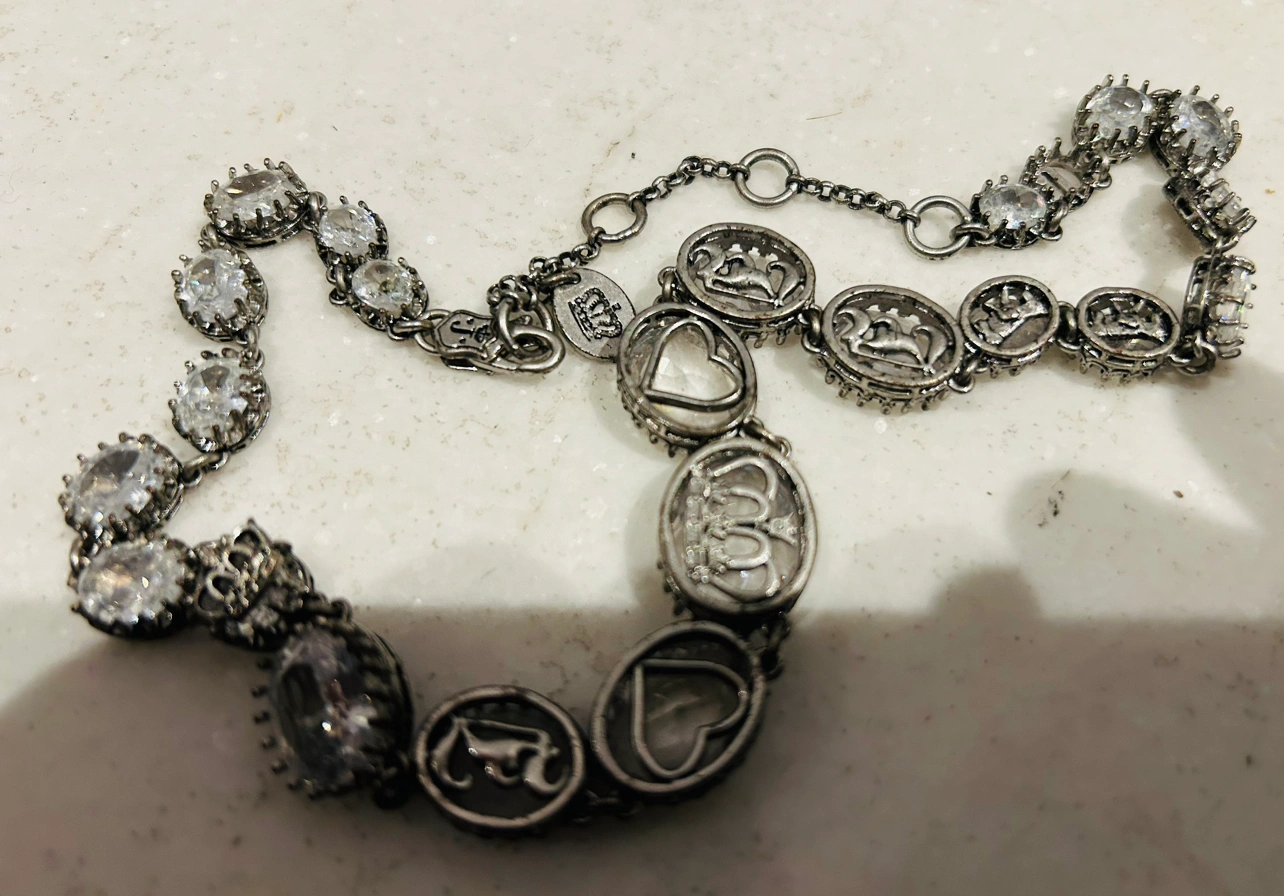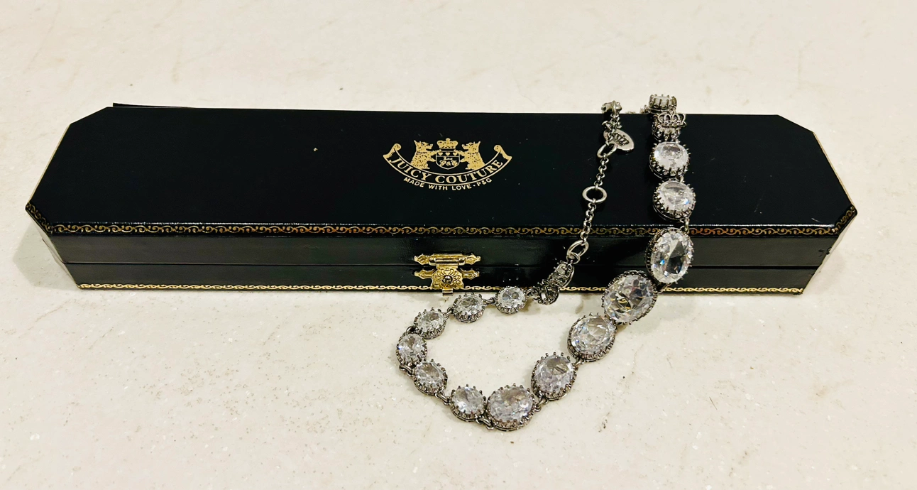Gorgeous Y2K juicy couture rhinestone necklace in original box. Never worn. Silver plate chain. So beautiful!