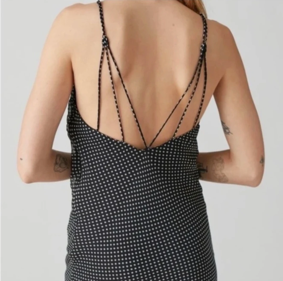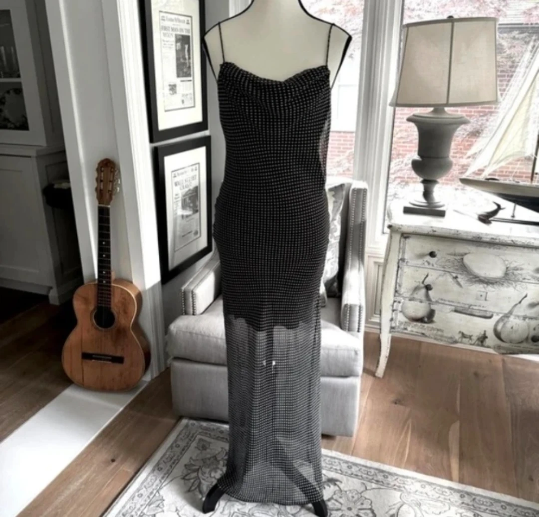 Sheer polka dot slip dress with adjustable spaghetti straps. It's a midi-length dress with a cowl neck. This dress is perfect for a night out!