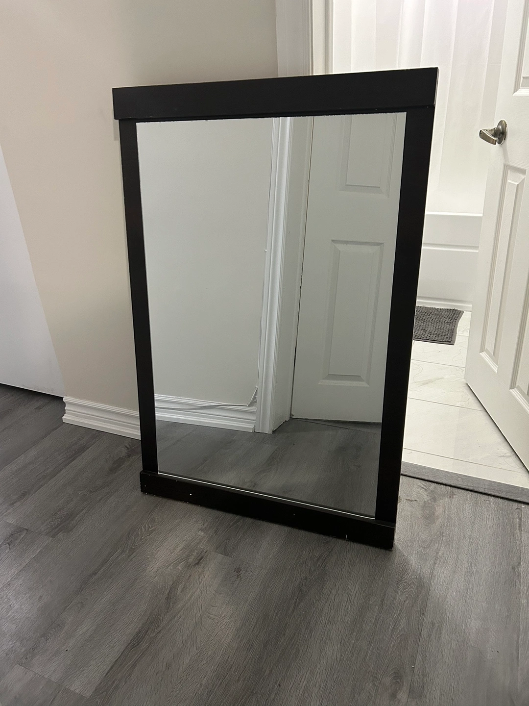 A large sized mirror with no blemishes on the surface. There are no hooks.