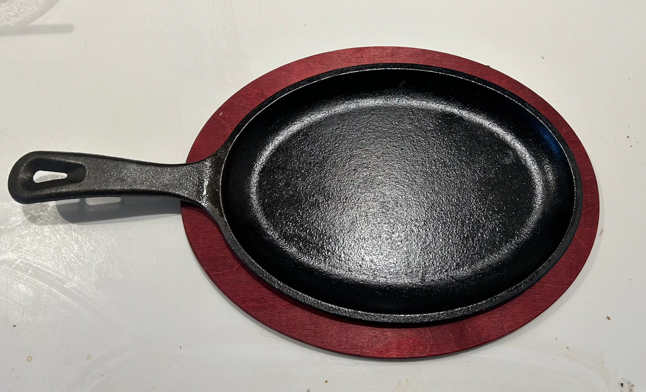 Lodge cast iron fajita pan and wooden serving tray
