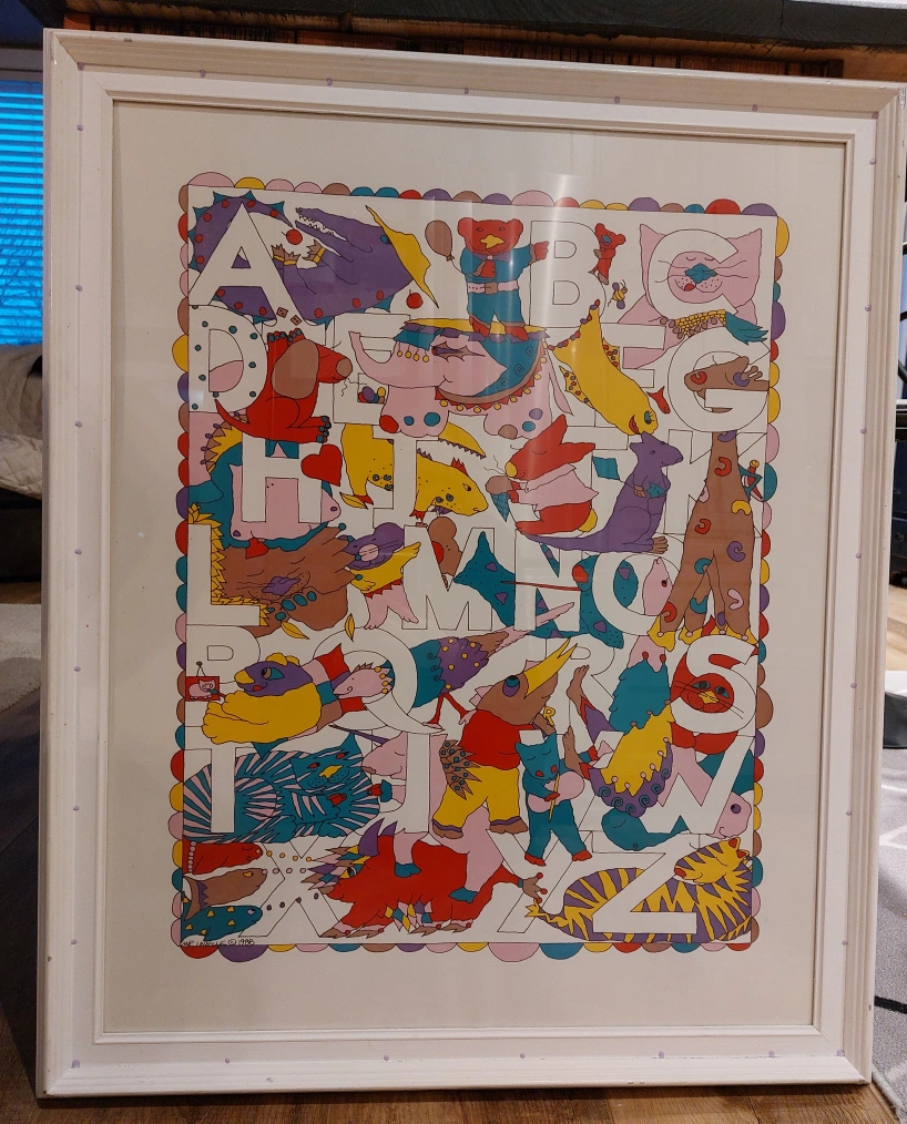 Whimsical alphabet print! Great for a nursery or toddlers room. Each letter of the alphabet has corresponding animal! Frame needs paint touch-up.