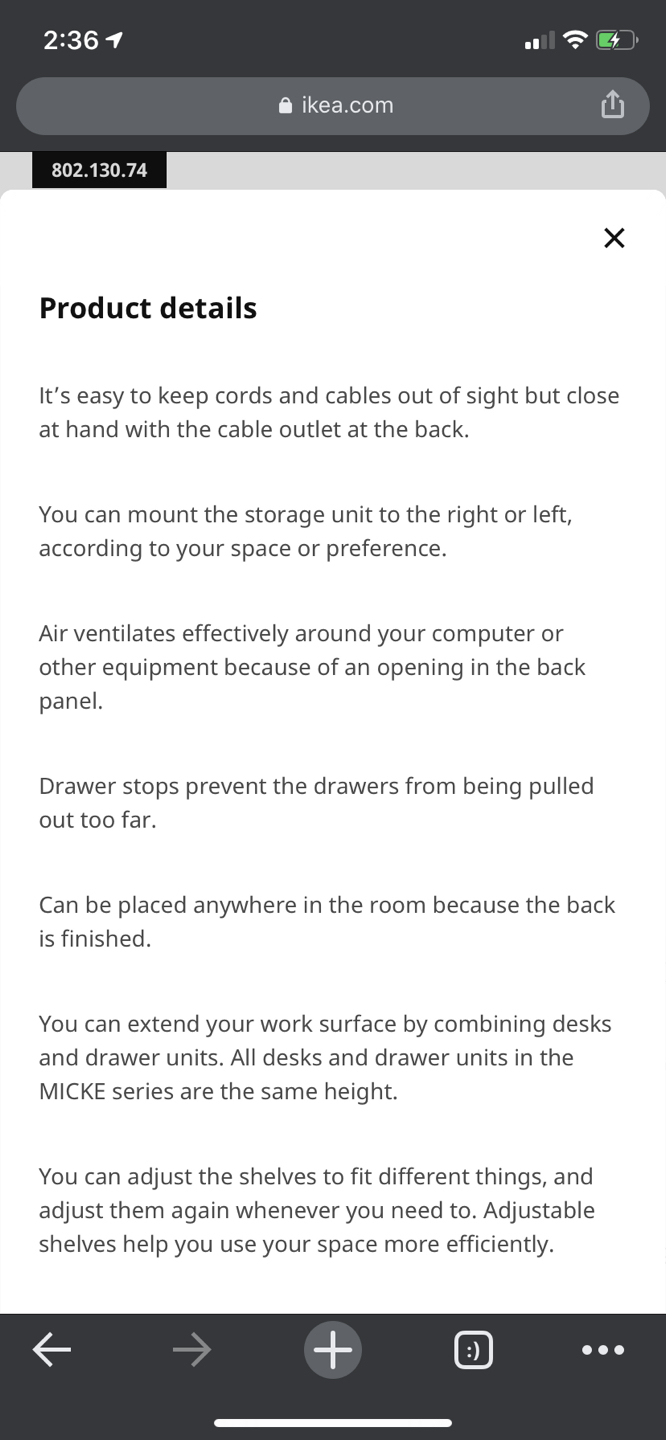 Good simple desk. Hides cords. Can combine with other ikea items. Great for back to school or home office.