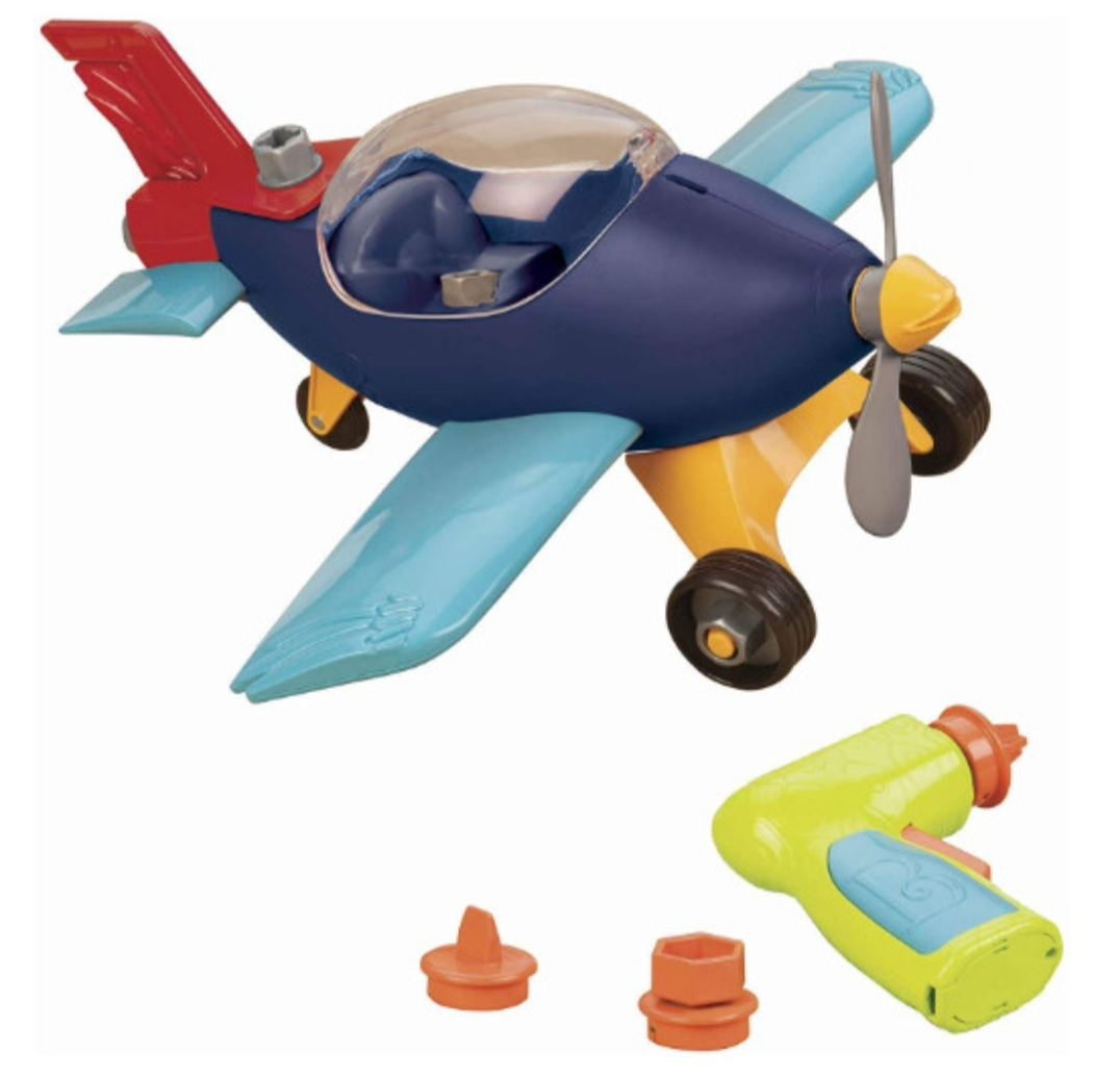 5722 COLORFUL PIECES: This educational toy set comes with airplane parts, a battery-powered drill, and bits. TINY HANDS FRIENDLY: Chunky pieces are easy to grab and put in place with a drill that’s user-friendly. MOTOR SKILLS: Helps with concentration, color and shape sorting, as well as fine and gross motor skills. READY FOR TAKE-OFF: Put all the pieces together and take it for a spin around the room! SAFE AND STURDY: Made of strong and durable plastic. All of Battat’s toys are tested and meet or exceed the highest safety standards. CLEANING’S EASY: Rough landing in the mud? Wipe it clean, and it’s ready to go!