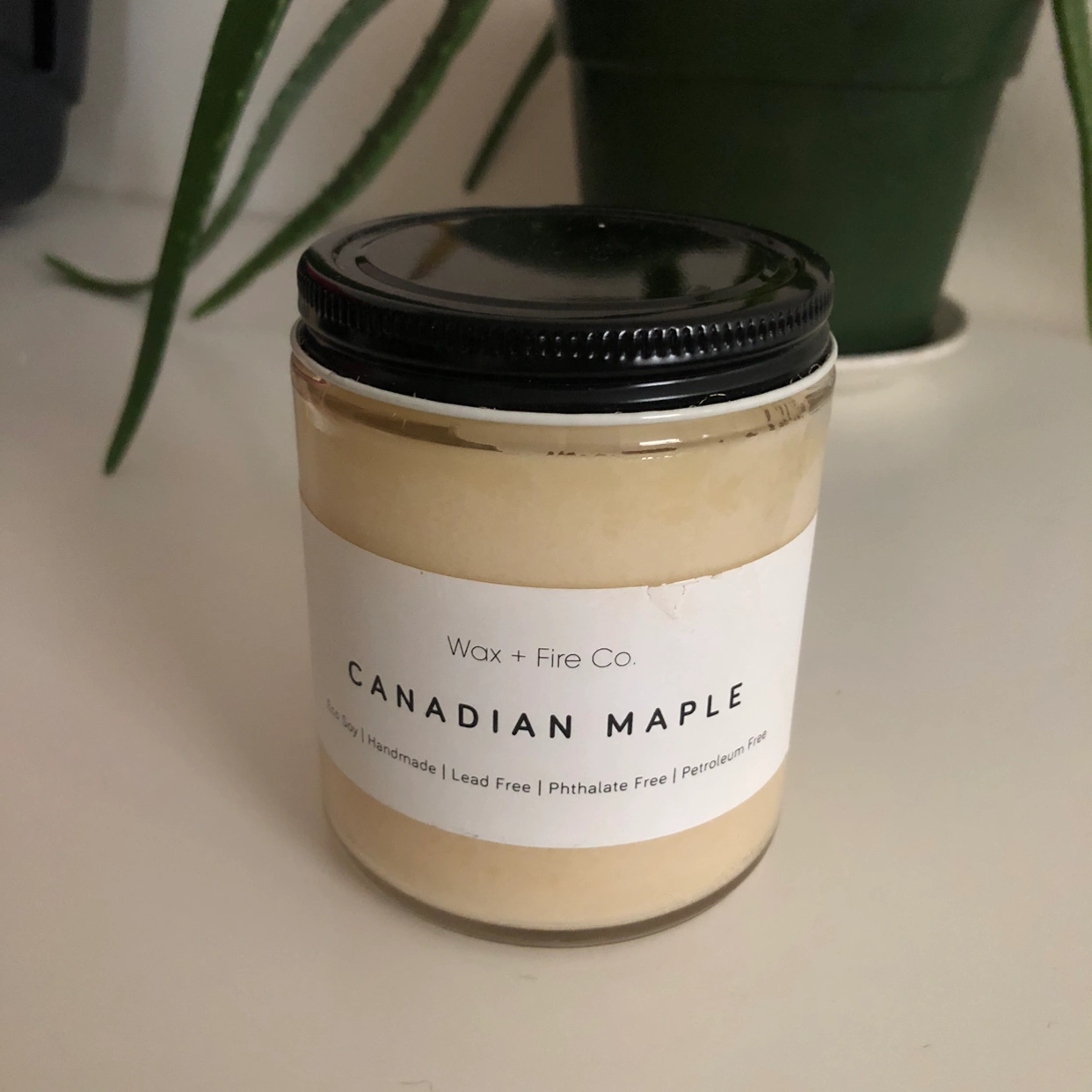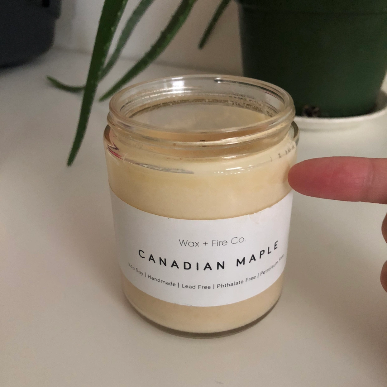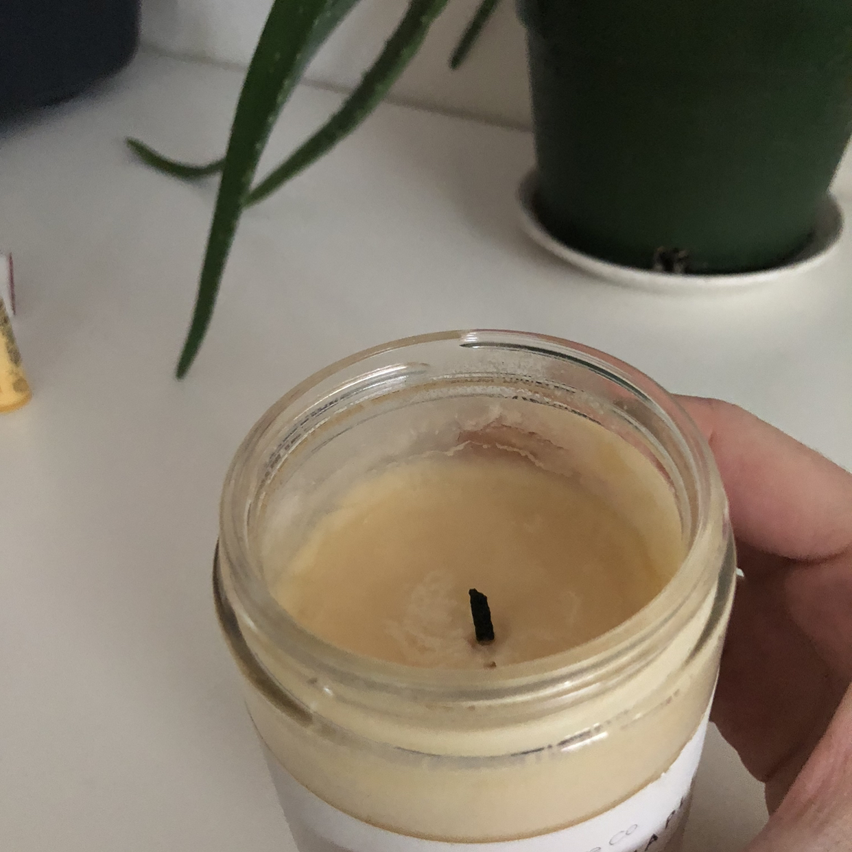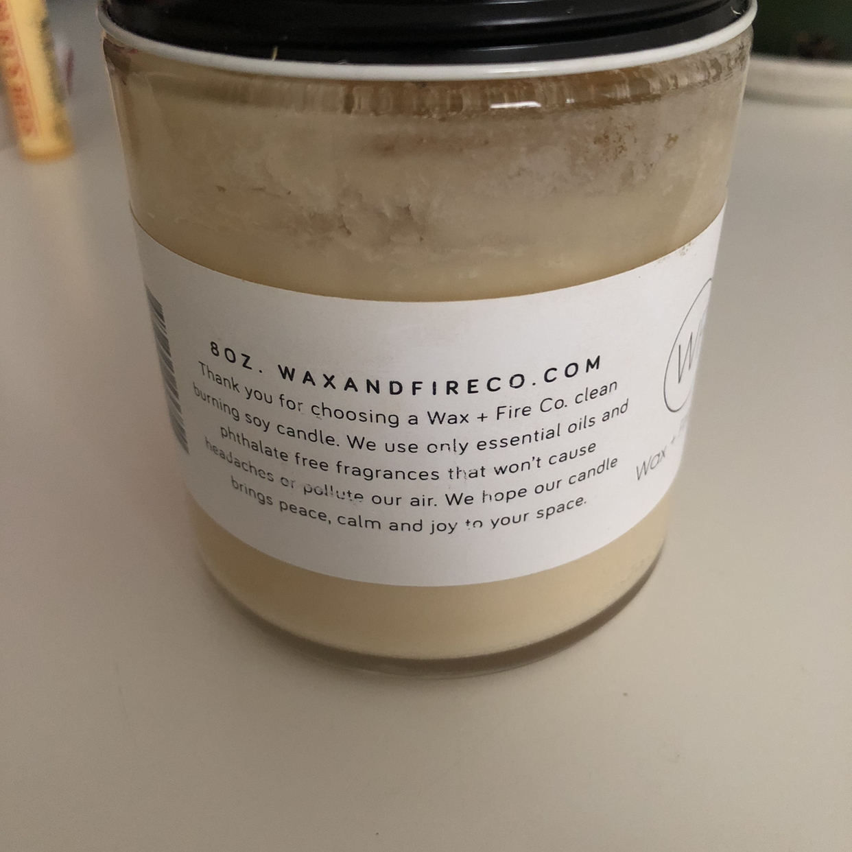 Vegan soy candle, scented with essential oils only. Burned a little bit but have too many candles. 80% full, lots of burn life left! (See third photo with finger to see candle level)