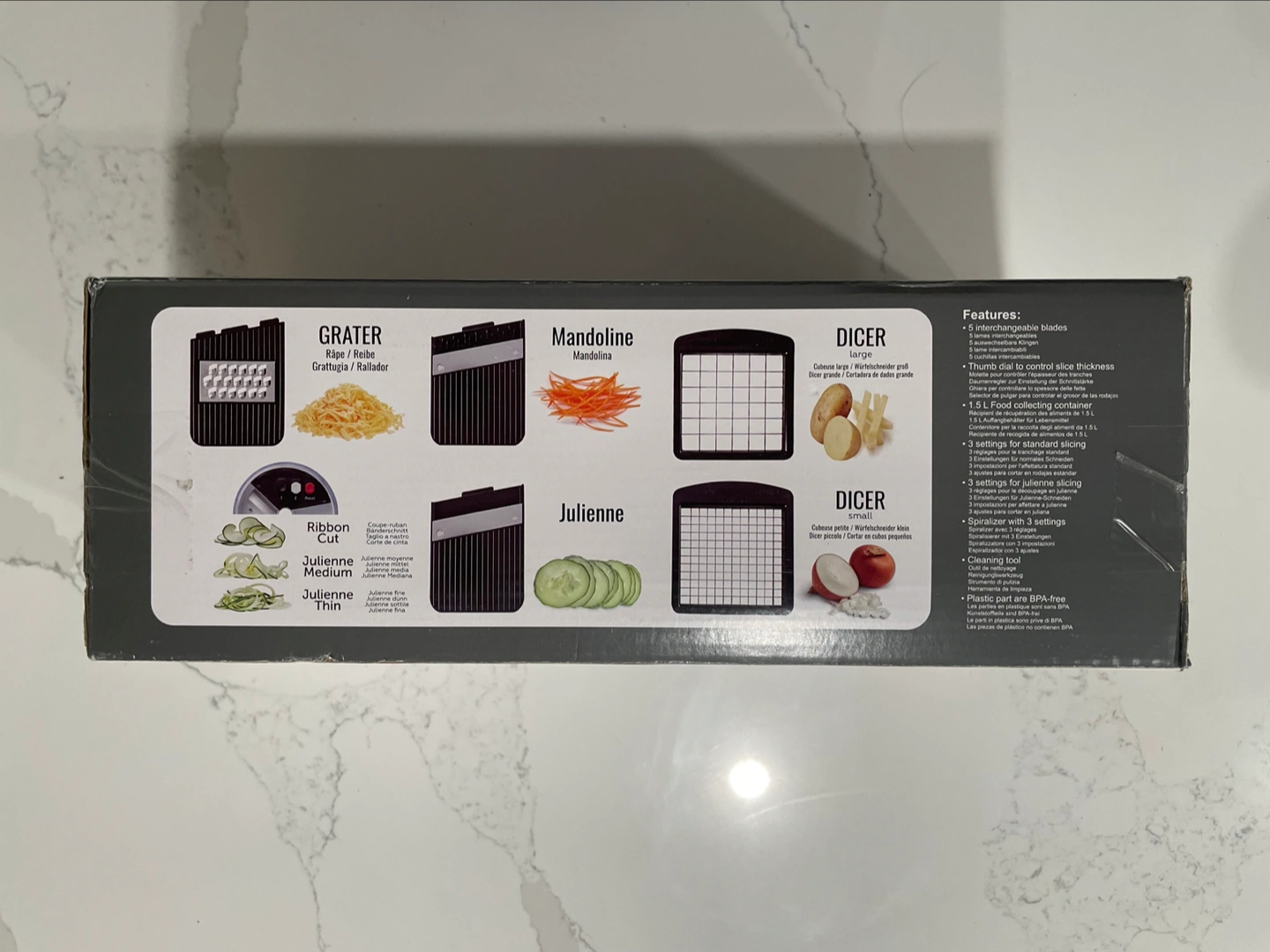 5 interchangeable blades: slicing/mandoline, grater, small dicer, large dicer and julienne.