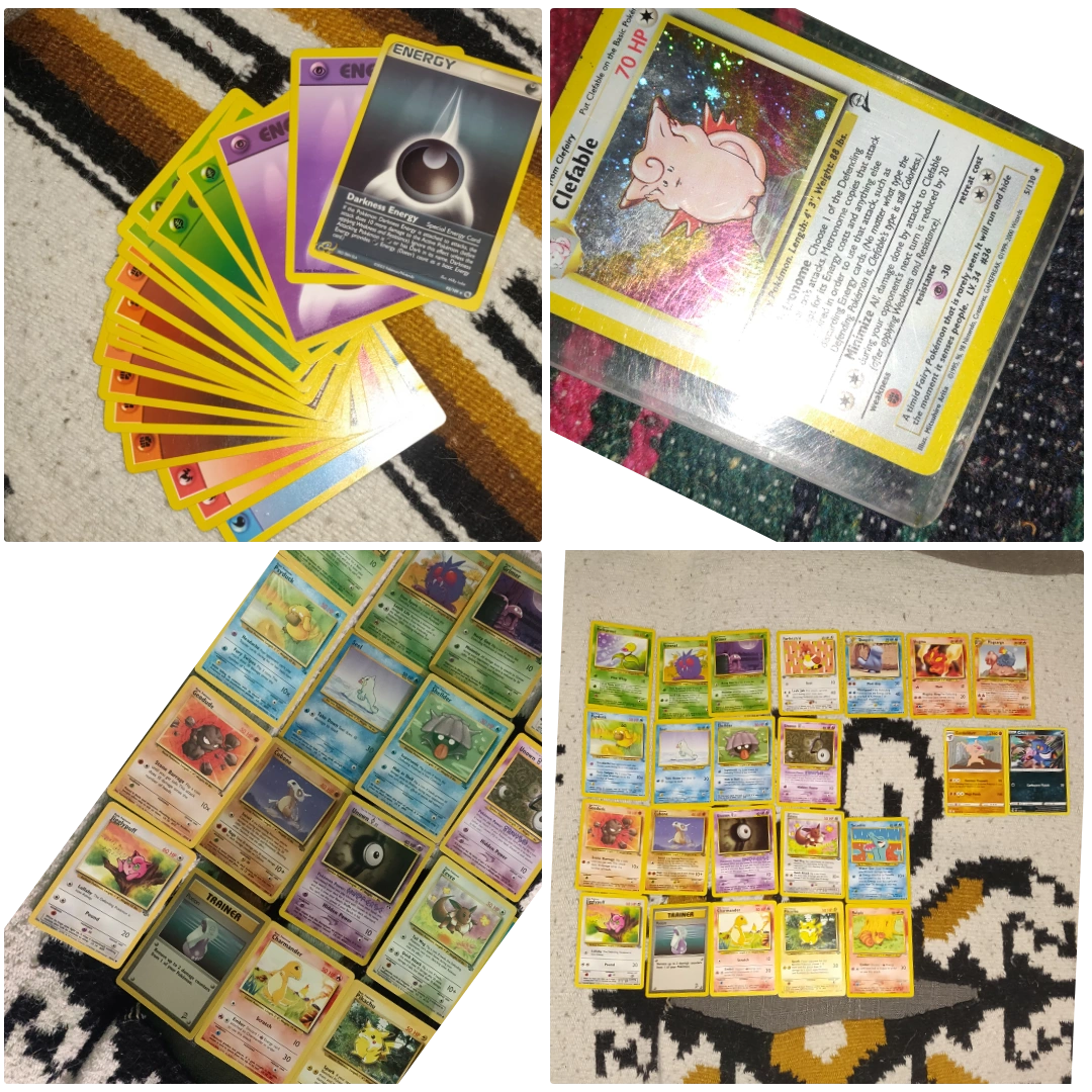 Great condition cards up for grabs ! 71 Magic the Gathering Cards, including holographic cards, 111 Pokemon cards, 5 cards from 2021, the rest from the 1990s, 19 energy cards, 4 first edition cards, 1 Holo Clefable given free to the buyer of the collection !