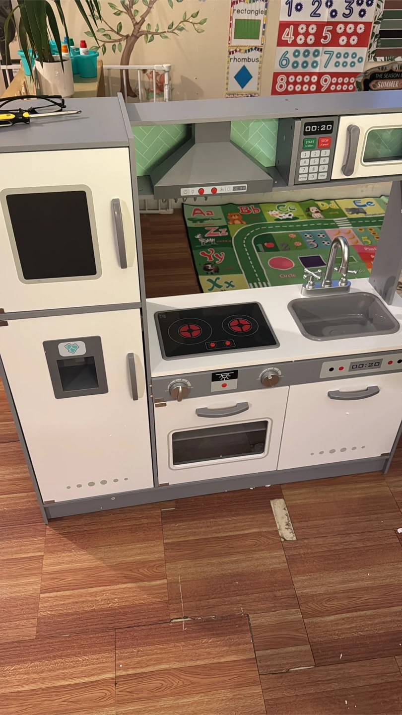 This is a wooden play kitchen with an oven, stovetop, and refrigerator. It includes a sink and faucet. It's great for imaginative play and developing motor skills. Perfect for a child's playroom!