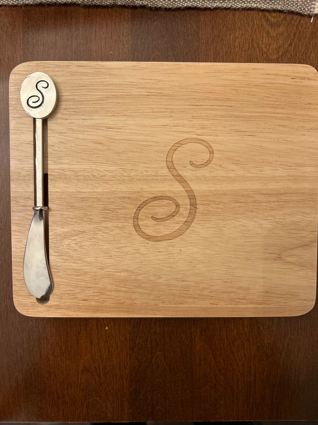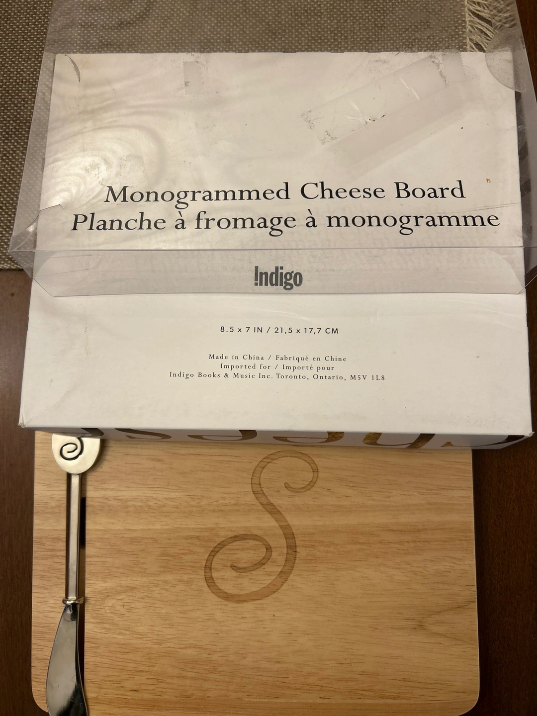 New monogrammed cheese board with “S” initial. Comes with cheese knife. From Chapters. Very sweet hostess gift.