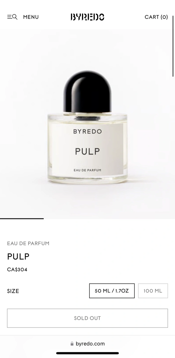 BYREDO Pulp Eau de Parfum, 50 mL · Top notes: bergamot, blackcurrant, cardamom · Heart notes: fig, red apple, tiare · Base notes: cedarwood, peach flower, praline *retails for $295 (plus tax) *blind bought it, realized it’s not for me ($200 price is firm)