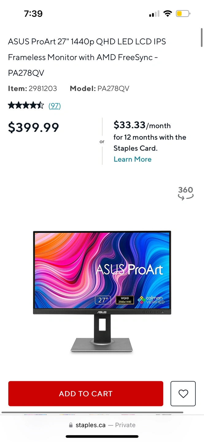 ASUS ProArt Display PA278QV 27-inch Professional Monitor, with Color Accuracy, Calman Verified, ProArt Preset, ProArt Palette, & Ergonomic Stand.