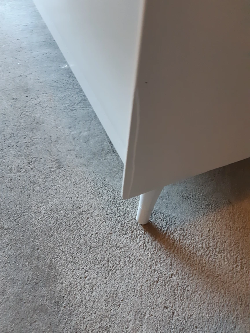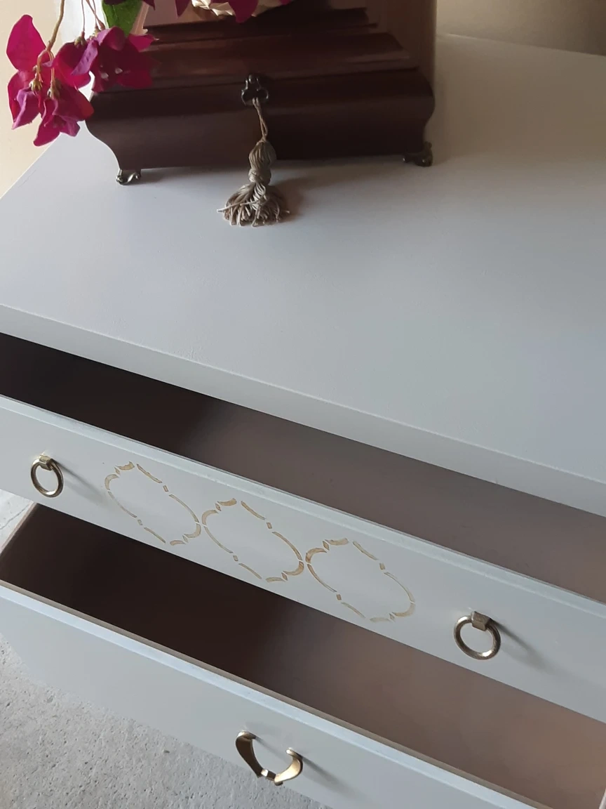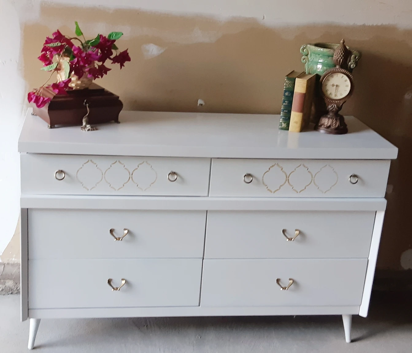 beautiful white wood dresser with 6 drawers , top two are narrow and bottom 4 are deep. A little chip on the lower right corner, not that noticable( decor not included)