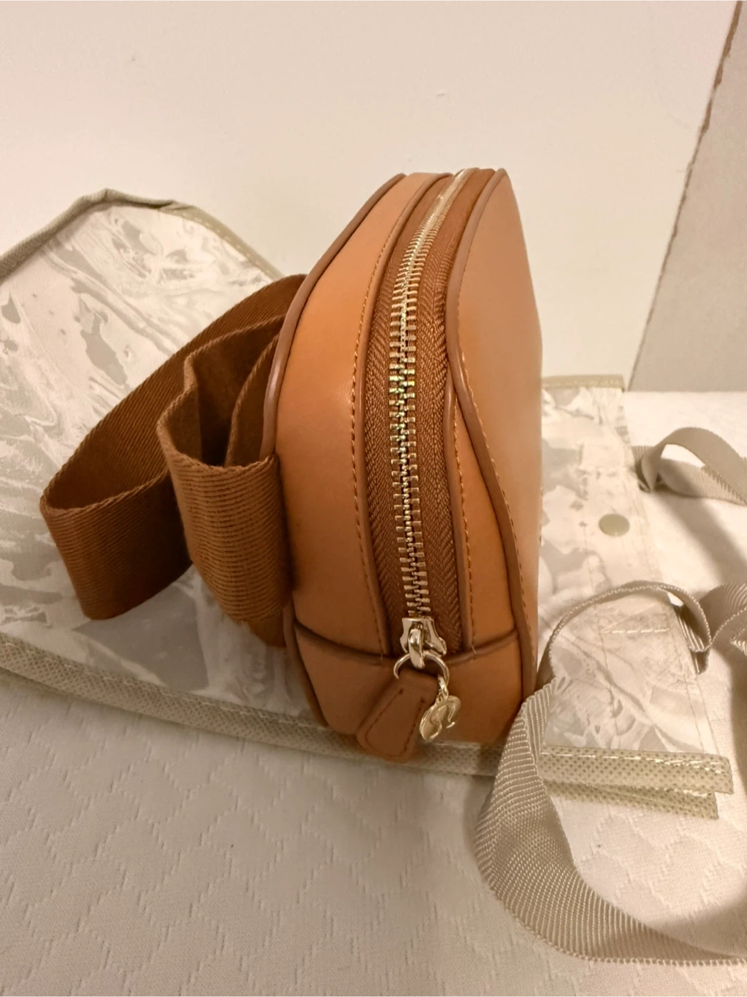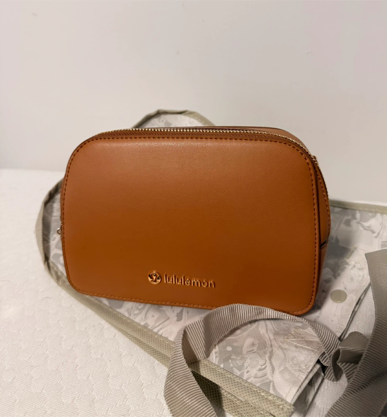 A Lululemon crossbody bag in a rich brown colour. It's made of faux leather and has a zippered closure. This bag is great for carrying essentials.