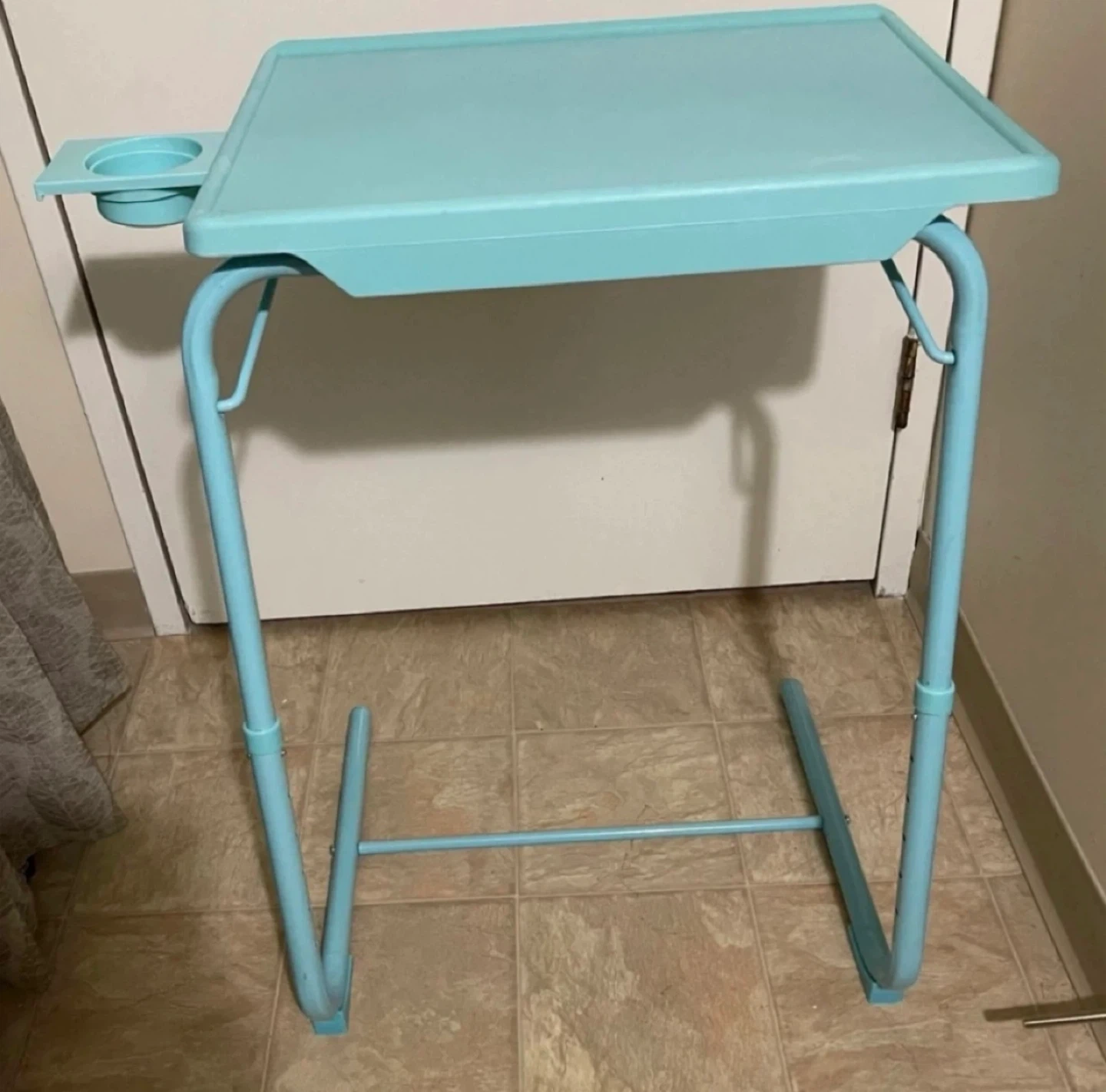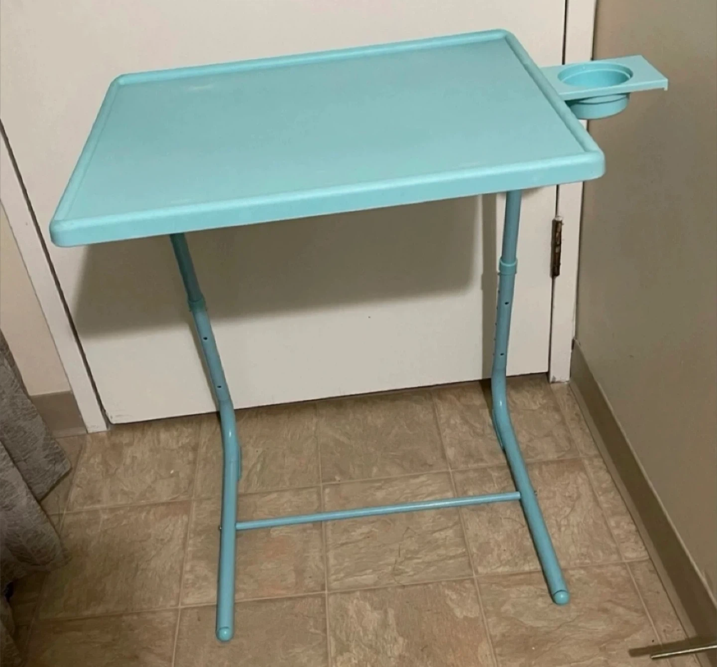 Adjustable, portable, and foldable lap desk / TV tray table with a convenient built-in cup holder. Perfect for reading, studying, working, or enjoying a meal or a snack in bed or on sofa/couch. Rarely used. It’s in excellent condition like new. From smoke-free, pest-free, and pet-free home.