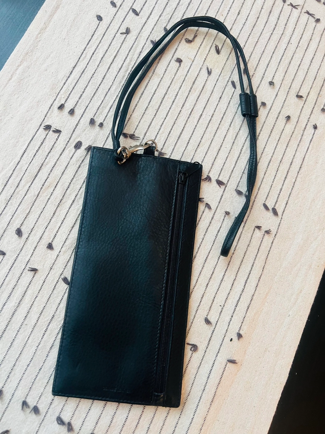 Black leather ID/passport holder holder. Features a clear window, several card slots, and a zippered pocket. Includes a long black lanyard. Ideal for airport traveling.
