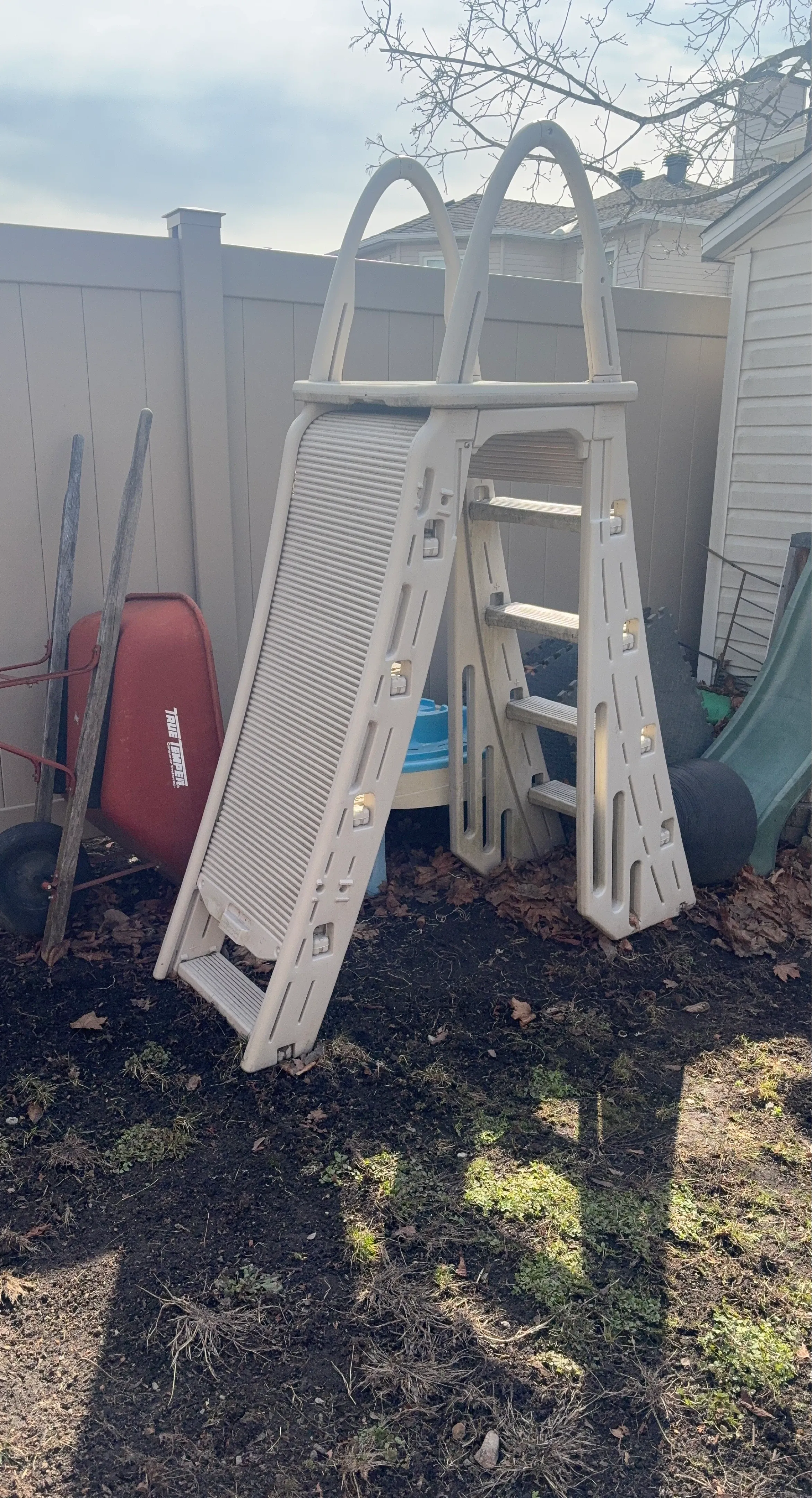 This is a plastic water slide and ladder set, designed for use with above-ground pools. It's made of durable, weather-resistant plastic. The ladder provides easy access to the slide.