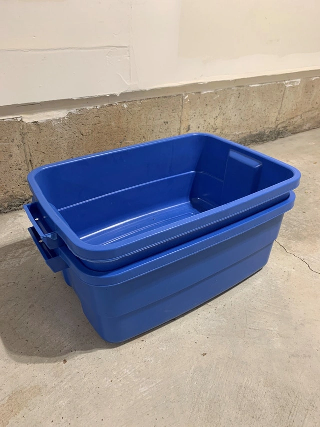 I have two 38L (10 gal) Rubbermaid Roughneck Storage totes with lids. Dimensions: 24”x16”x9”. Excellent condition. Various other sizes and colors also available, so please inquire.